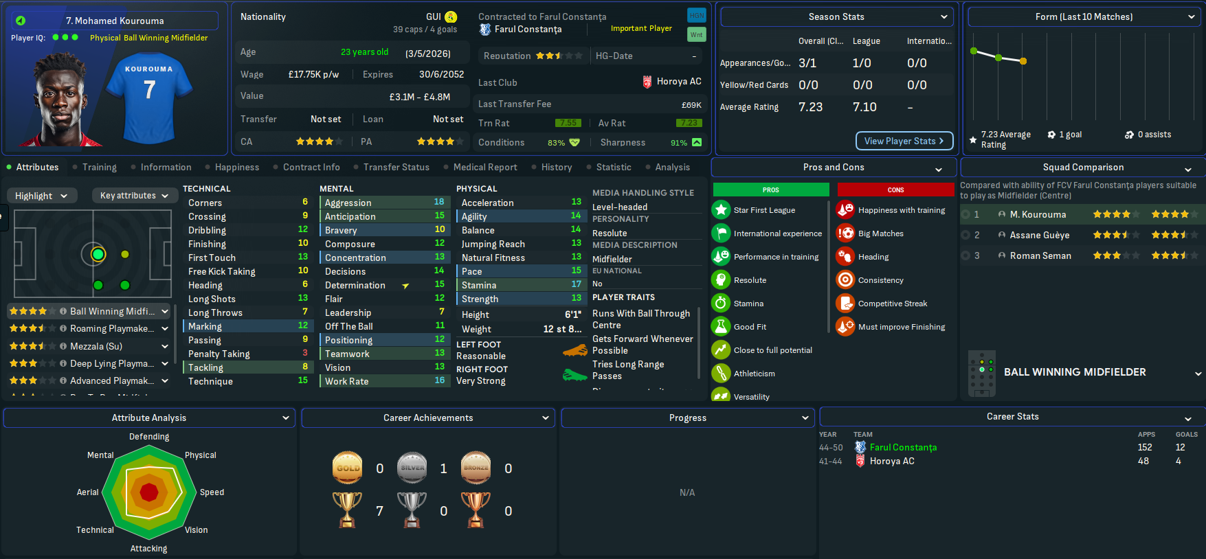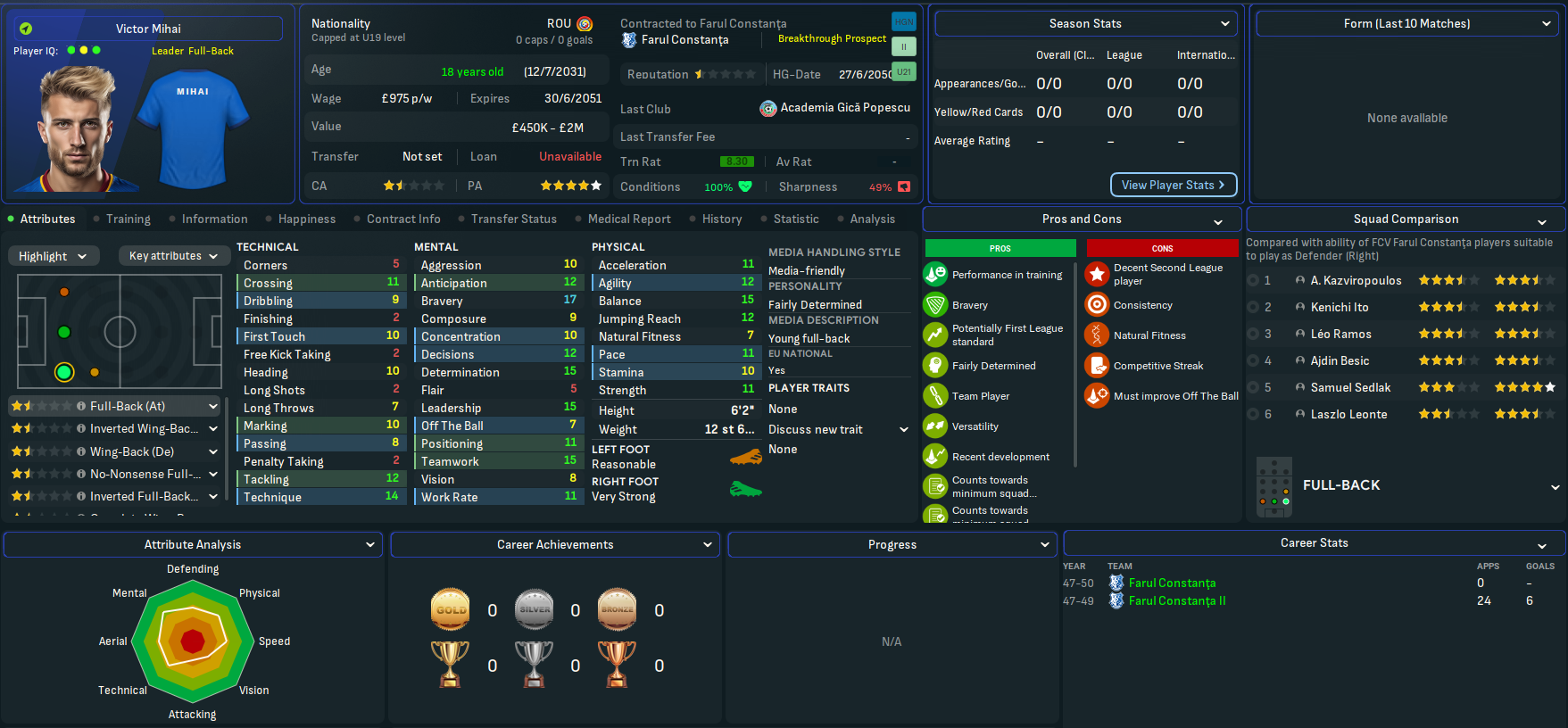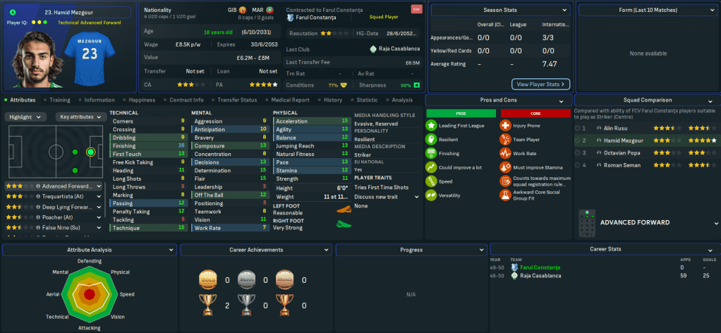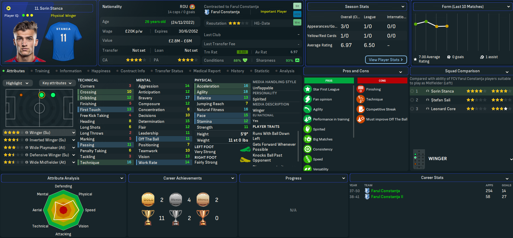 Farul has a reputation for producing young players through its youth academy originally established by Romanian legend Gheorghe Hagi, who coached the club at the start of this save and remains a club legend. That tradition remains with homegrown midfielder Mohamed Kourouma the best player at the club alongsidewingers Sorin Stanca and Emmanuel Bahi, 6ft 5in midfielder Assane Guéye, left back Ajdin Besic, holding midfielder Kenta Yamazaki and homegrown striker Alin Rusu. There were plenty more promising talents in centre backs Samuel Sedlak, Victor Mihai and Cristian Baciu, midfielder Andrei Nituica and striker Dennis Tielemans. And Mahtal initially opted for a standard 4-3-3 approach.