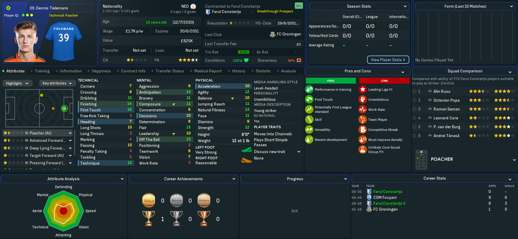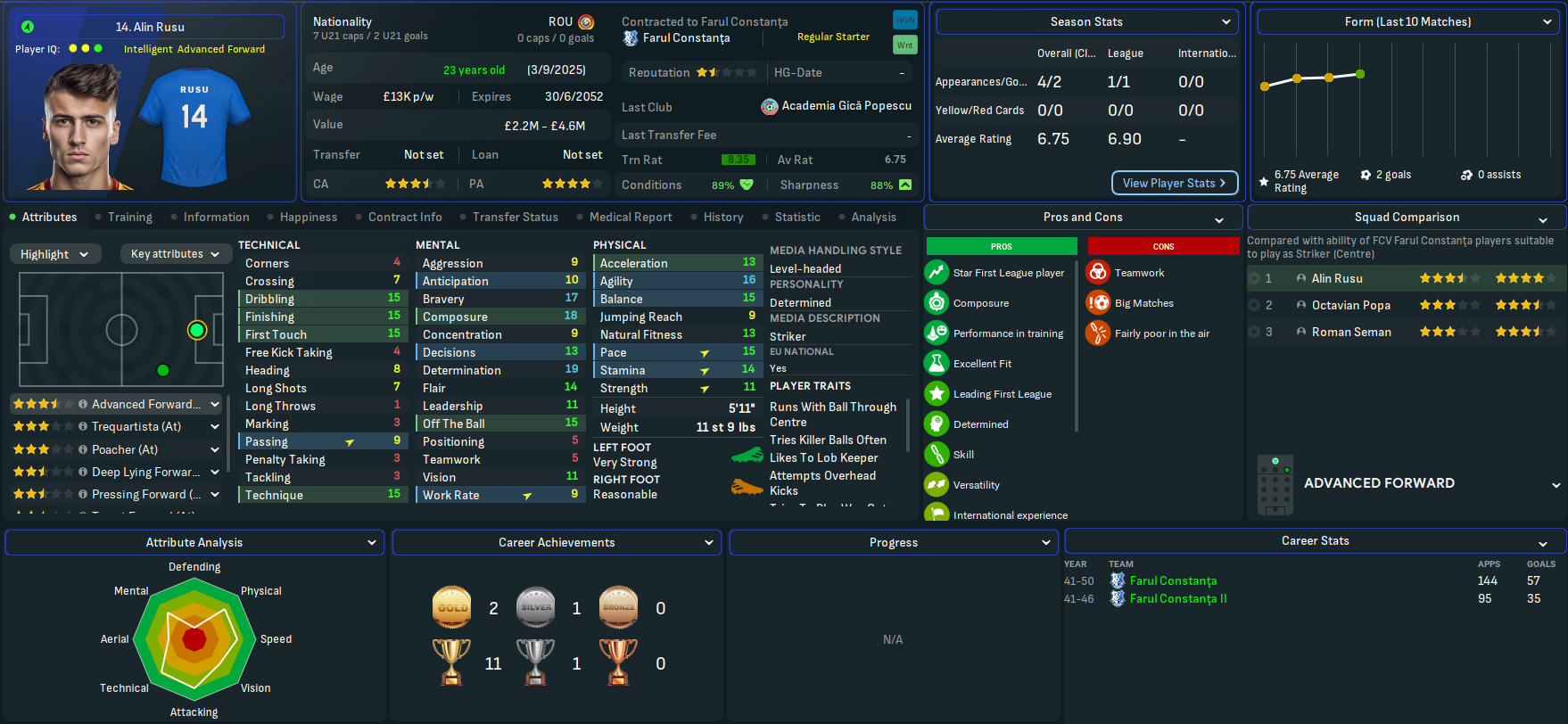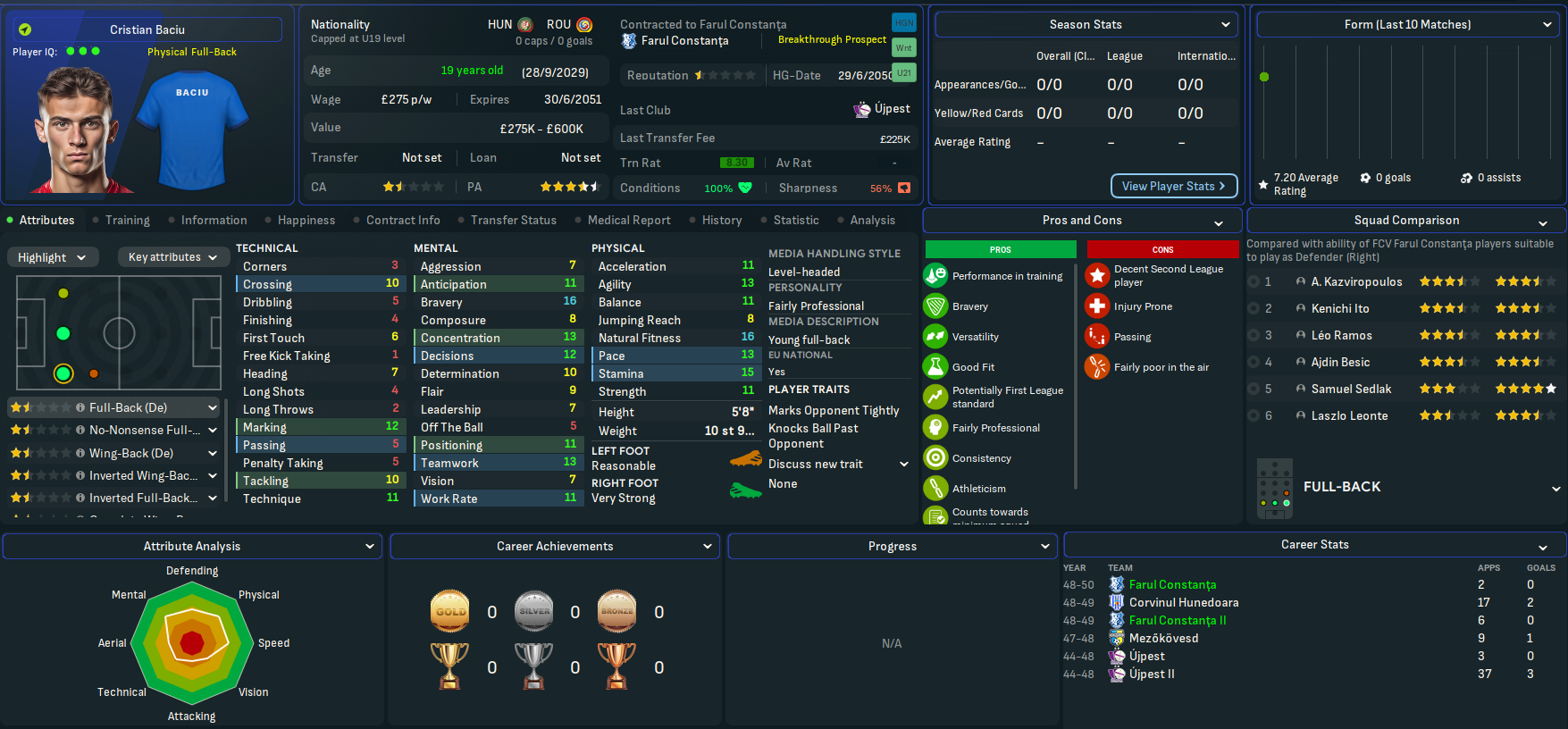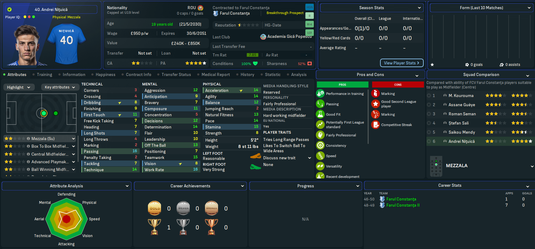Farul has a reputation for producing young players through its youth academy originally established by Romanian legend Gheorghe Hagi, who coached the club at the start of this save and remains a club legend. That tradition remains with homegrown midfielder Mohamed Kourouma the best player at the club alongsidewingers Sorin Stanca and Emmanuel Bahi, 6ft 5in midfielder Assane Guéye, left back Ajdin Besic, holding midfielder Kenta Yamazaki and homegrown striker Alin Rusu. There were plenty more promising talents in centre backs Samuel Sedlak, Victor Mihai and Cristian Baciu, midfielder Andrei Nituica and striker Dennis Tielemans. And Mahtal initially opted for a standard 4-3-3 approach.