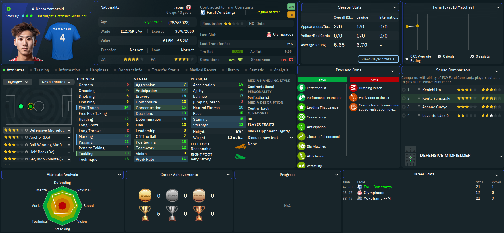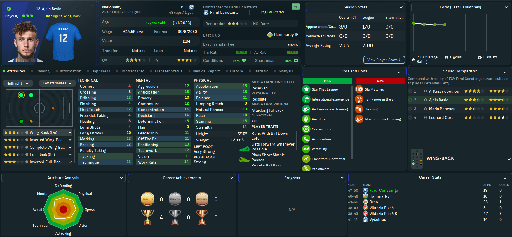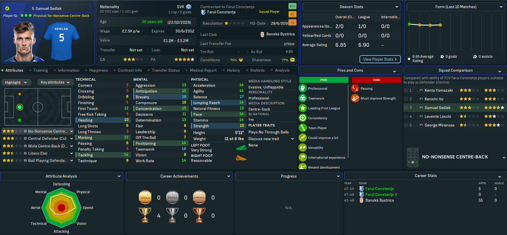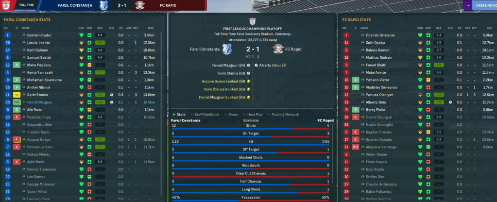 Farul has a reputation for producing young players through its youth academy originally established by Romanian legend Gheorghe Hagi, who coached the club at the start of this save and remains a club legend. That tradition remains with homegrown midfielder Mohamed Kourouma the best player at the club alongsidewingers Sorin Stanca and Emmanuel Bahi, 6ft 5in midfielder Assane Guéye, left back Ajdin Besic, holding midfielder Kenta Yamazaki and homegrown striker Alin Rusu. There were plenty more promising talents in centre backs Samuel Sedlak, Victor Mihai and Cristian Baciu, midfielder Andrei Nituica and striker Dennis Tielemans. And Mahtal initially opted for a standard 4-3-3 approach.