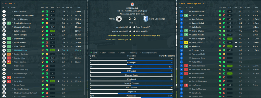 Farul got back on track as late Rusu and Sedlak goals edged a 3-1 win over Craiova and Popa nicked a 1-0 at CFR Cluj. That teed up a big game against leaders FC Rapid and Farul delivered with Popa and Rusu goals earning a comfortable 2-0 victory. Form was a little iffy as they navigated domestic and European matters, but a 2-1 win at home to U Cluj took them above their opponents into 2nd, four points off leaders Rapid halfway through the season. But they maintained that form while others faltered and a 2-0 win over Sepsi sent them top of the league for the first time in mid-December.