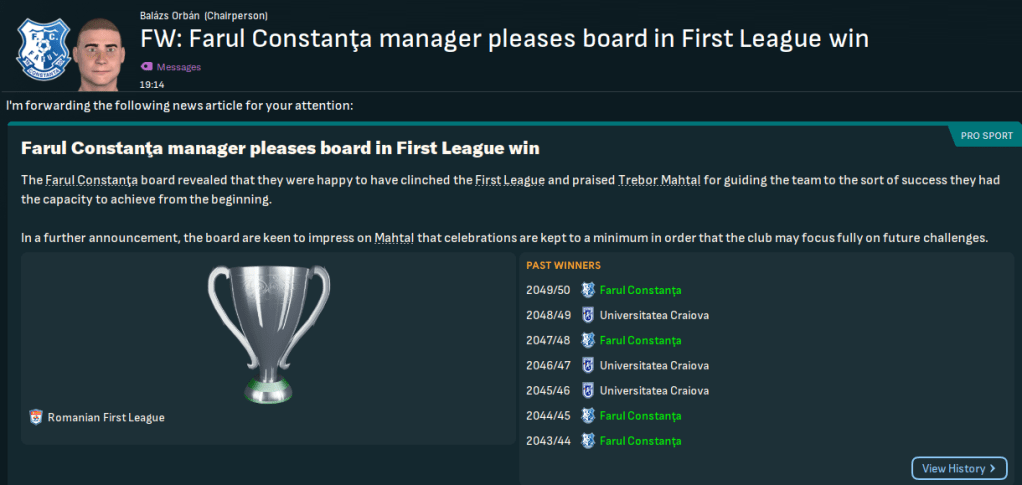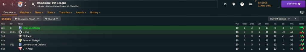 Farul have won seven titles during this save, most recently in the 2048 campaign. They were favourites to defend the title last season but finished in a disappointing 5th, and remain 6/5 favourites this season ahead of FC Rapid (11/2), FCSB (7/1), holders Univeritartea Craiova (8/1) and U Cluj (9/1).