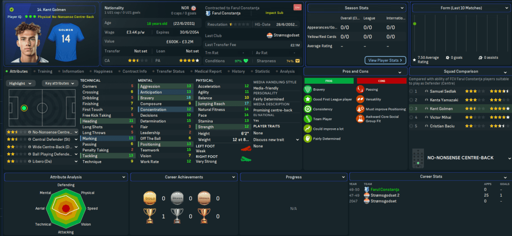 Farul started the 2050s with a disappointing 1-0 loss at Craiova and a slightly better 1-1 at FC Rapid. Mahtal eventually started spending some of the £23m transfer kitty he’d generated, bringing in 18-year-old attacker Hamid Mezgour for £6.5m from Raja Casablanca and centre back Kent Golmen for £2.1m from Stromsgodset.