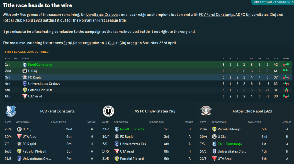 Game 1 – U Cluj (2nd, away): Farul had a rare week off going into a huge title decider. And that showed as Popa’s brace and late Stanca and Mezgour strikes secured a superb 4-1 win to move four points clear.