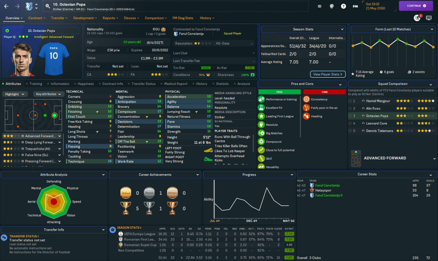 Farul has a reputation for producing young players through its youth academy originally established by Romanian legend Gheorghe Hagi, who coached the club at the start of this save and remains a club legend. That tradition remains with homegrown midfielder Mohamed Kourouma the best player at the club alongsidewingers Sorin Stanca and Emmanuel Bahi, 6ft 5in midfielder Assane Guéye, left back Ajdin Besic, holding midfielder Kenta Yamazaki and homegrown striker Alin Rusu. There were plenty more promising talents in centre backs Samuel Sedlak, Victor Mihai and Cristian Baciu, midfielder Andrei Nituica and striker Dennis Tielemans. And Mahtal initially opted for a standard 4-3-3 approach.