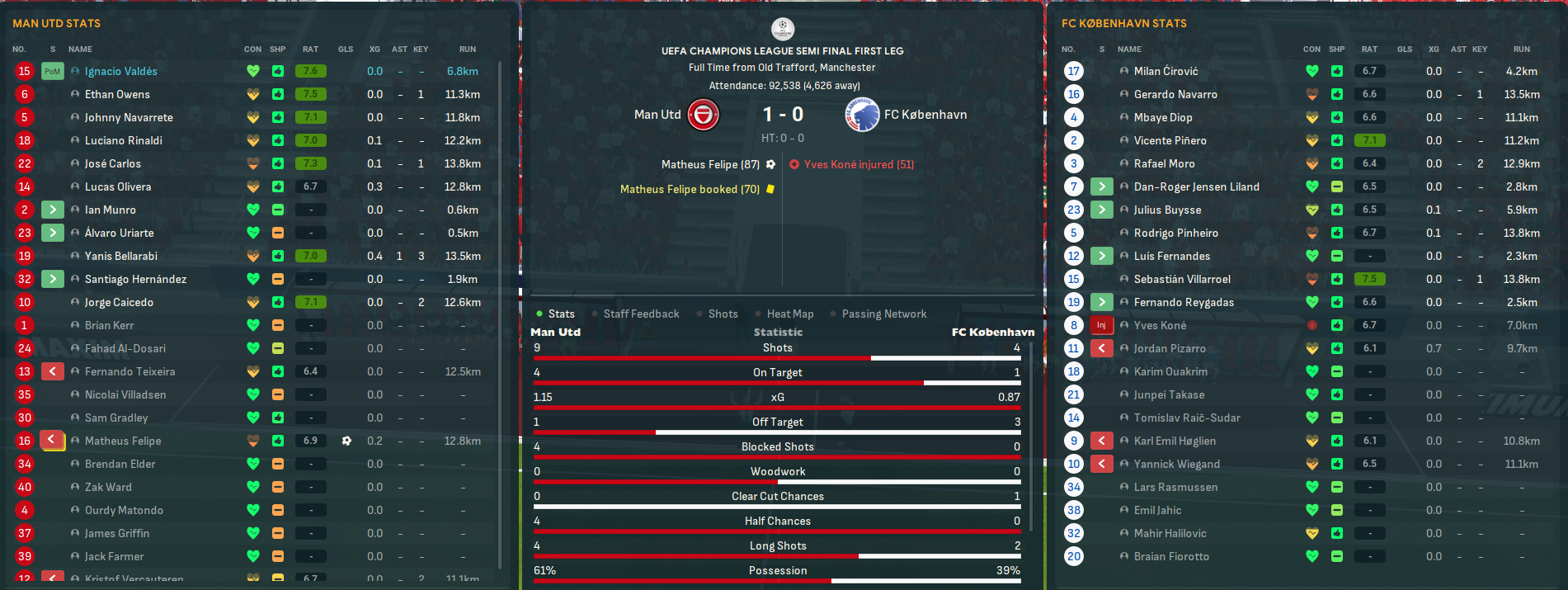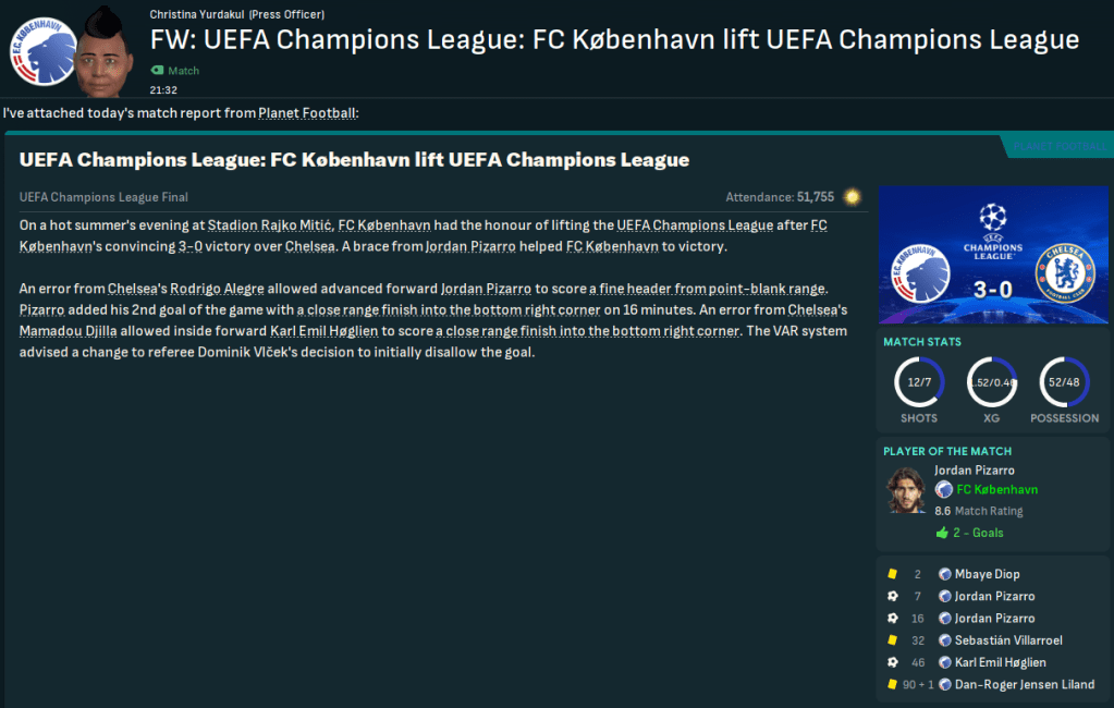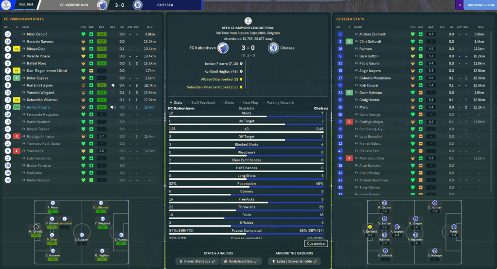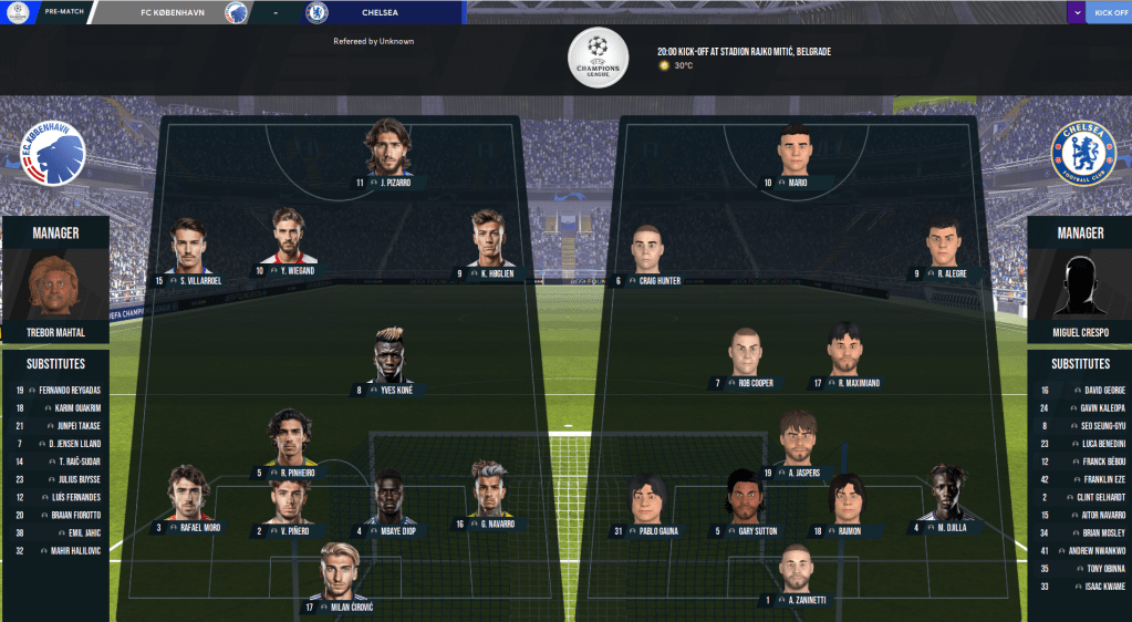 The Champions League Final saw Mahtal head back to one of his former hunting grounds as FC København took on Chelsea at Rajko Mitic, the home of Crvena zvezda. København were obviously in their first Champions League Final, while Chelsea were appearing in their second of this save, which they lost to Liverpool in 2031. Mahtal’s main injury concern was Jensen Liland, who wasn’t quite ready to start, so he lined up:
