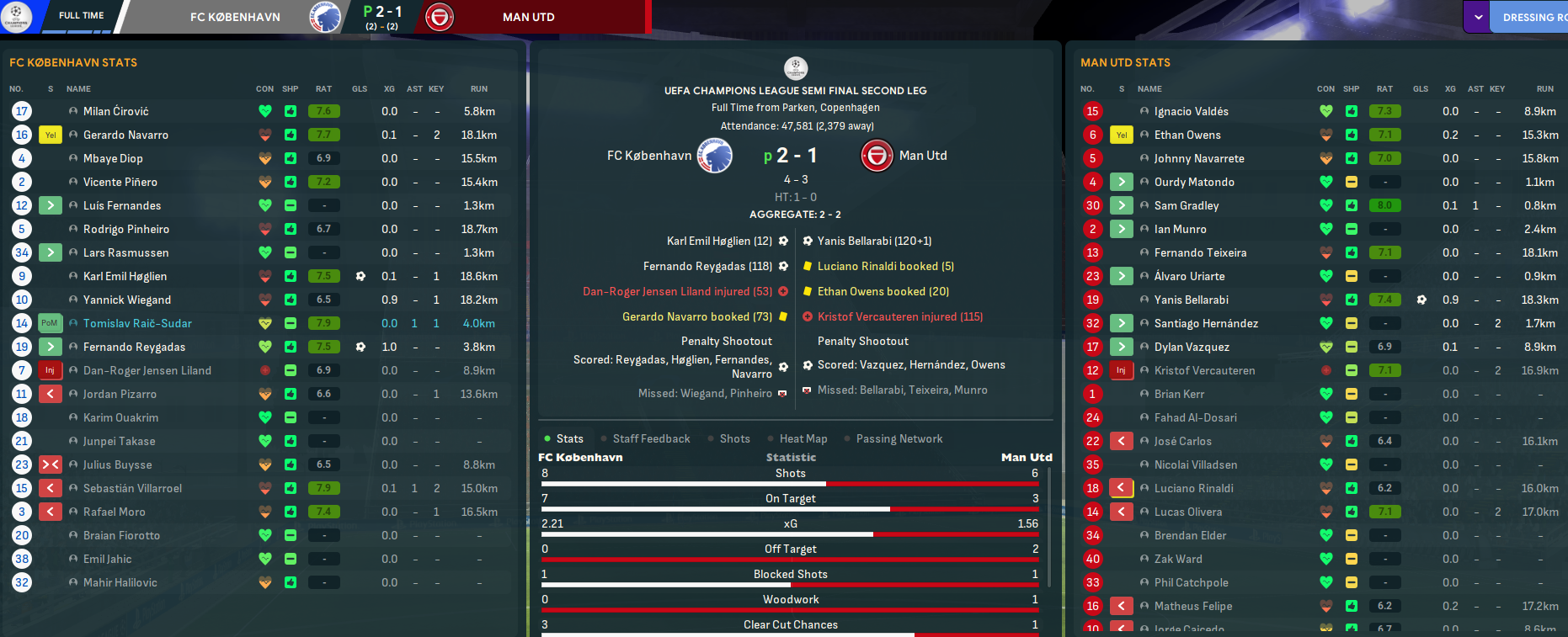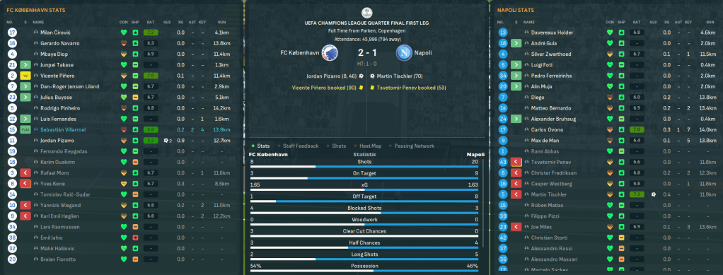 Next up was Napoli starting at home and they did so wonderfully as Pizarro powered home a close range header from Villarroel’s excellent cross after 8 minutes. Nothing else happened in the first half but the same two players linked up 23 seconds after the break. Napoli had a lot of shots and eventually got into it with a very lucky goal from a corner that was dubiously awarded by goalline technology, but København edged a 2-1 win. Mahtal rested the entire team for the league game between the legs, which did the trick as they limited Napoli to just nine shots and Wiegand’s goal just before half time sent them through.