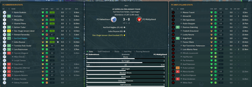 A tricky final 16 tie followed against Tottenham and Mahtal racked up 1,500 games in Football Manager with a trip to London. His team couldn’t earn a victory that such an accolade deserved but did hold on for a 2-1 defeat after Spurs dominated. They were without both centre backs for the home leg and got a bit of a scare as Spurs’ striker missed a sitter after two minutes. But København dominated the first half and got their reward as Høglien levelled the tie up then moved ahead with Villarroel’s wonderstrike. Spurs undeservedly leveled it up again but the hosts continued to dominate and the two wingers again delivered late on to wrap up a superb 4-1 victory.