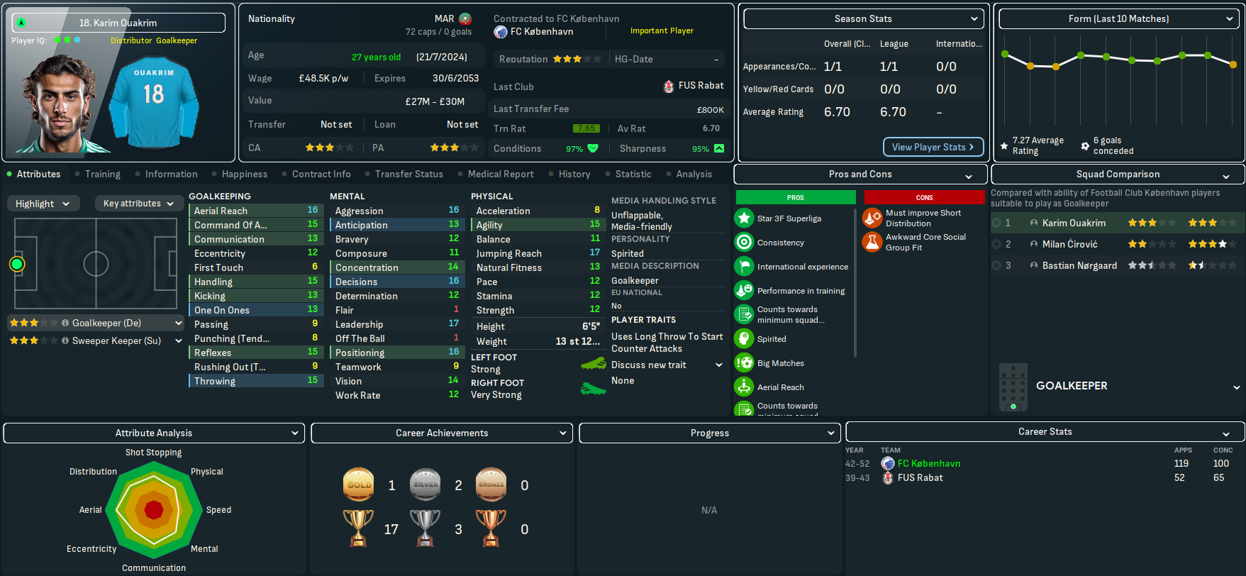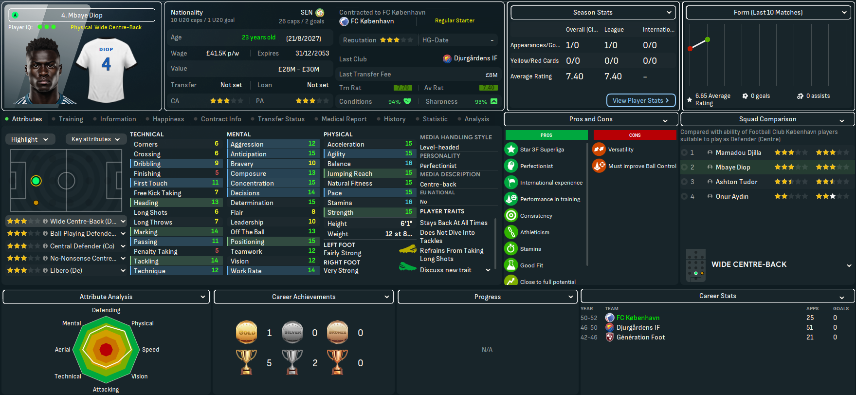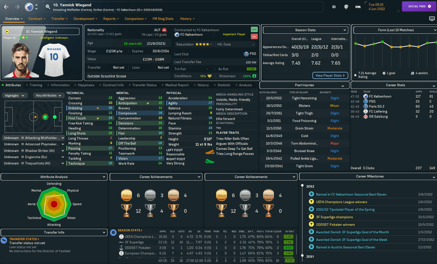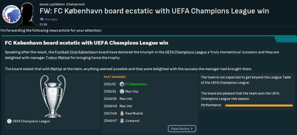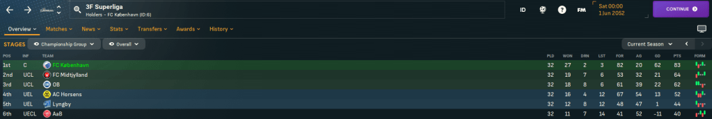 On paper, this doesn’t look like the most exciting challenge. København have won the last 23 league titles, 27 out of 28 during this save and 29 of the last 30 back to 2022. However, based on the players he’d seen over recent seasons, Mahtal thought the quality at the club would give him a chance to have a final crack at European competitions. Indeed, København sits 25th in the European coefficients, only behind RB Salzburg (17th) in the playable leagues available to Mahtal. In 28 years of being in the Champions League, they’ve never surpassed the Champions League round of 16 and have lost in the knockout playoff round in the last six seasons – but did win the Europa League in 2041.