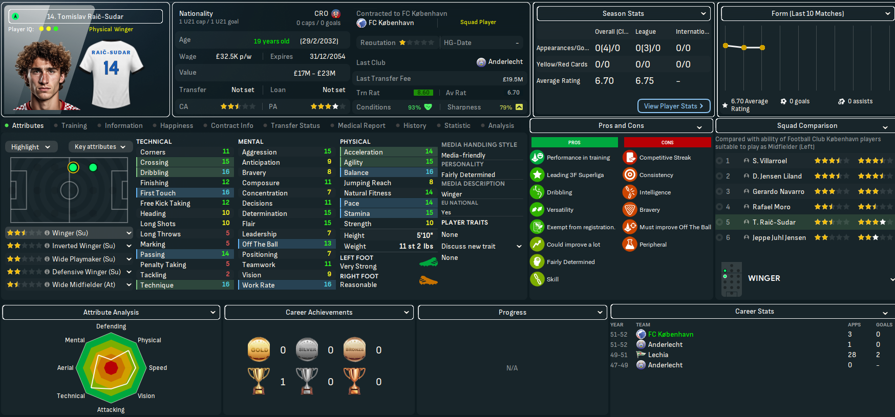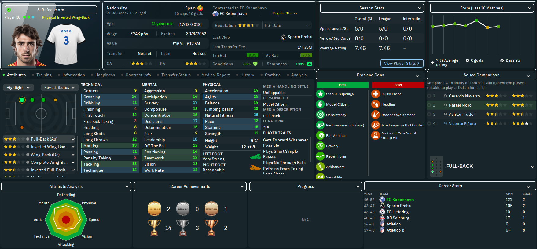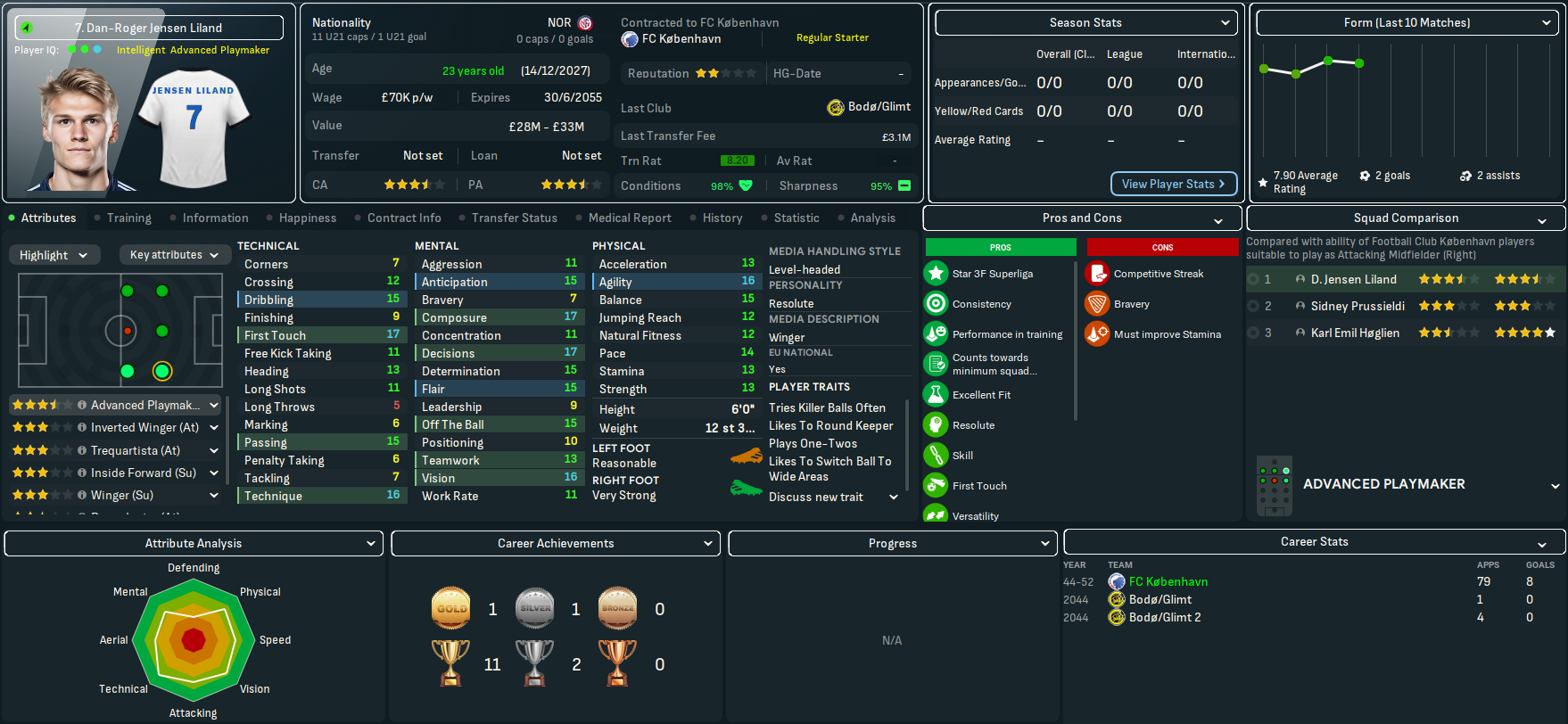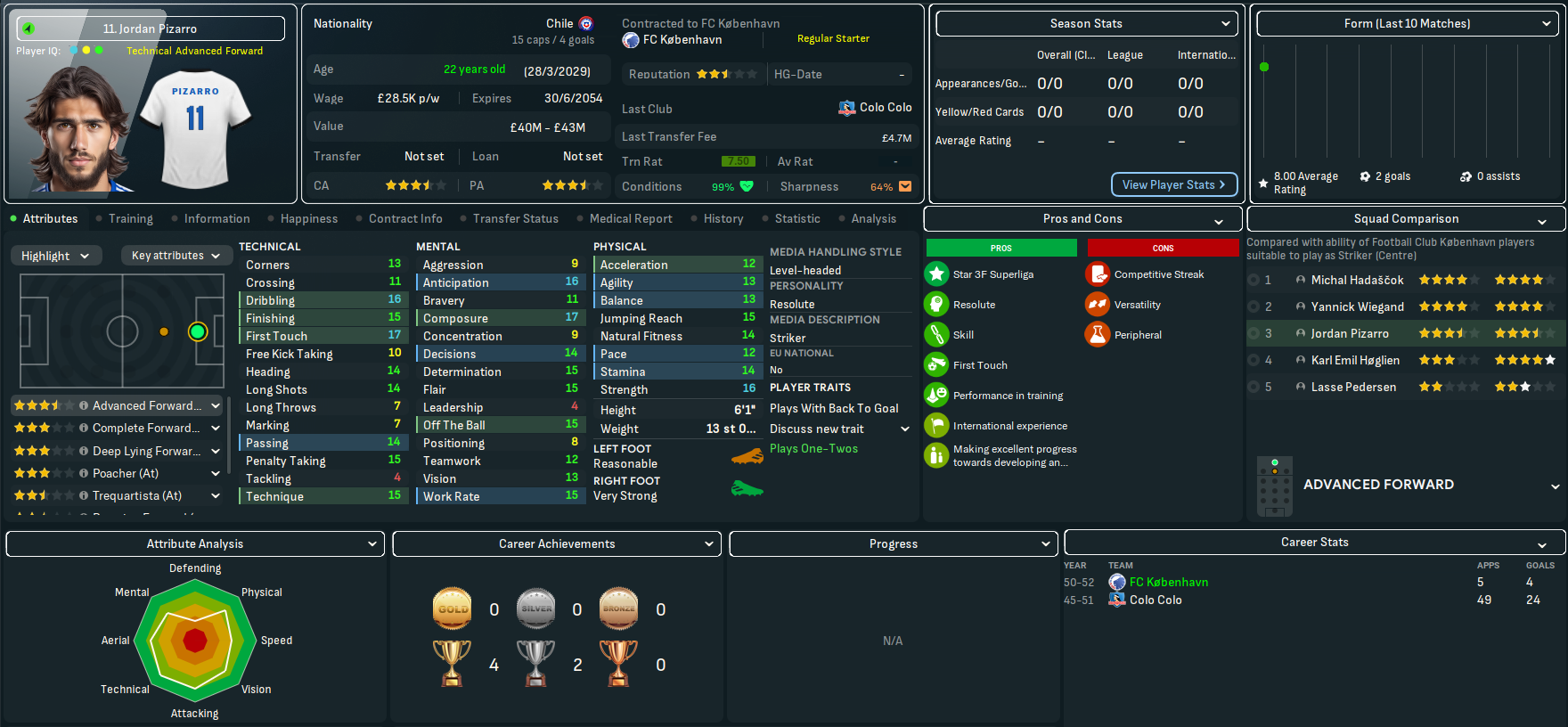 On paper, this doesn’t look like the most exciting challenge. København have won the last 23 league titles, 27 out of 28 during this save and 29 of the last 30 back to 2022. However, based on the players he’d seen over recent seasons, Mahtal thought the quality at the club would give him a chance to have a final crack at European competitions. Indeed, København sits 25th in the European coefficients, only behind RB Salzburg (17th) in the playable leagues available to Mahtal. In 28 years of being in the Champions League, they’ve never surpassed the Champions League round of 16 and have lost in the knockout playoff round in the last six seasons – but did win the Europa League in 2041.