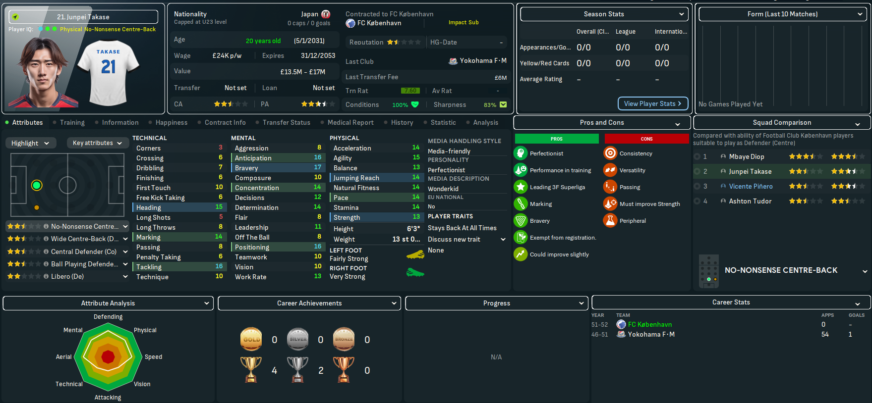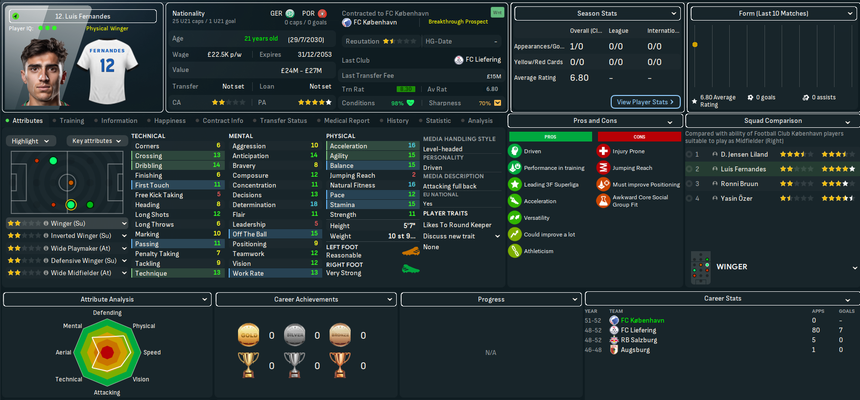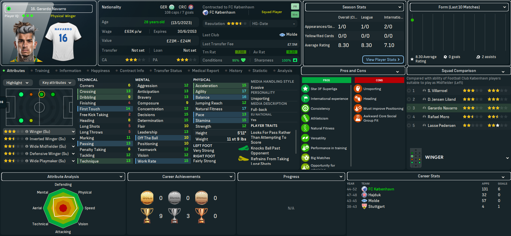 Mahtal had only ever intended on having one season at København, but the impressive domination he enjoyed meant he was definitely going to quit in the summer. So on 3 June 2052, he resigned as manager in the knowledge that his players were going to get picked apart by Europe’s elite. He leaves København with a wild 79% win ratio after 321 days and 54 games, of which he won 43, drew 3 and lost 8, scoring 131 and conceding 49.