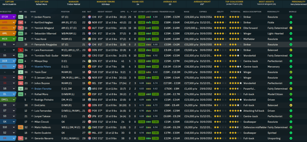 The star player was probably Wiegand, who scored 19 goals with 16 assists and a club-high 7.45 average rating in 43 games. He was pushed close by Pizarro with 26 goals and 9 assists and probably Mahtal’s two favourite players Høglien with 22 goals and 8 assists and Villarroel with 9 goals and 15 assists, while youngster Raic-Sudar impressed with 6 goals and 10 assists.