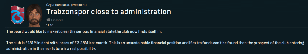 Mahtal sold anyone worth a decent amount and/or on big wages, moving on 16 players for £41m. That freed up over £500k of wage spend – taking them from £65k over the weekly budget of £682k to £442k under it. But realistically, even that transfer business wouldn’t be a drop in the ocean as the club had SIX outstanding club president loans and a bank loan interest payment totalling £180m, which were being paid off by £575k per month, and a crippling net debt of £136m.