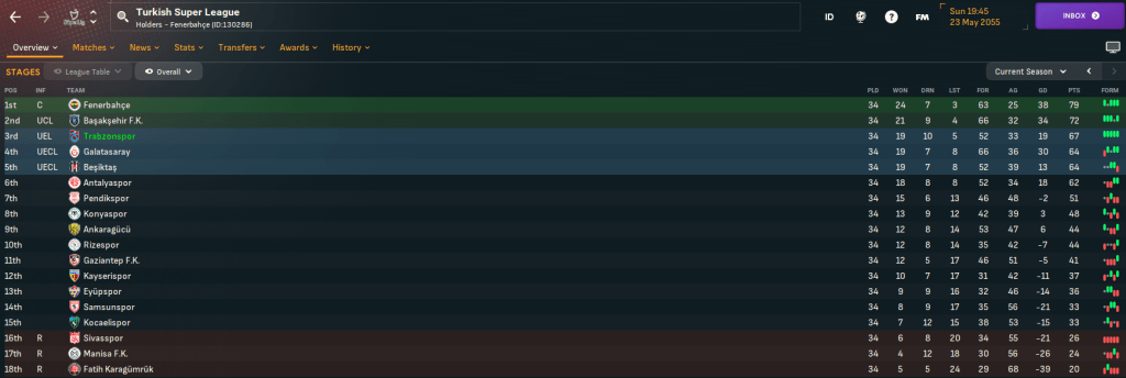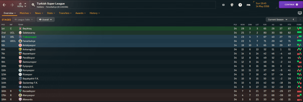 Trabzonspor had 52 points, trailing 3rd-place Besiktas by 4 points with five games remaining. But Mahtal provided a new manager bounce, beating Kayserispor 2-0, Antalyaspor 1-0 and Gaziantep 4-2 away to jump to 3rd. A late goal downed Eyupspor 1-0 to confirm European football before beating Besiktas 2-1 to secure 3rd place.
