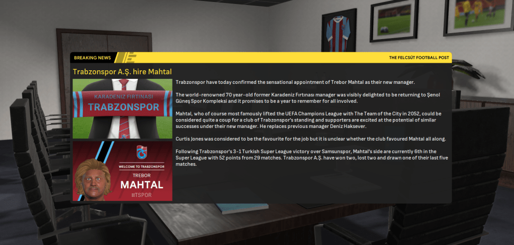 No jobs were available initially but a potentially big one did pop up offering a ridiculous redemption arc. Way back at the start of the 2041/42 campaign, Mahtal showed the ultimate lack of disloyalty as he spent 37 days in charge of Trabzonspor then jumped ship to Norway’s Molde. But 14 years on, the Turkish side sacked their manager of one year and immediately handed the Zambian a one-year deal – without even a mention of his previous horrendous lack of loyalty.