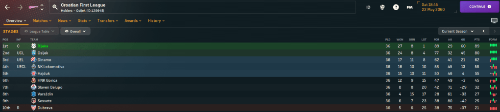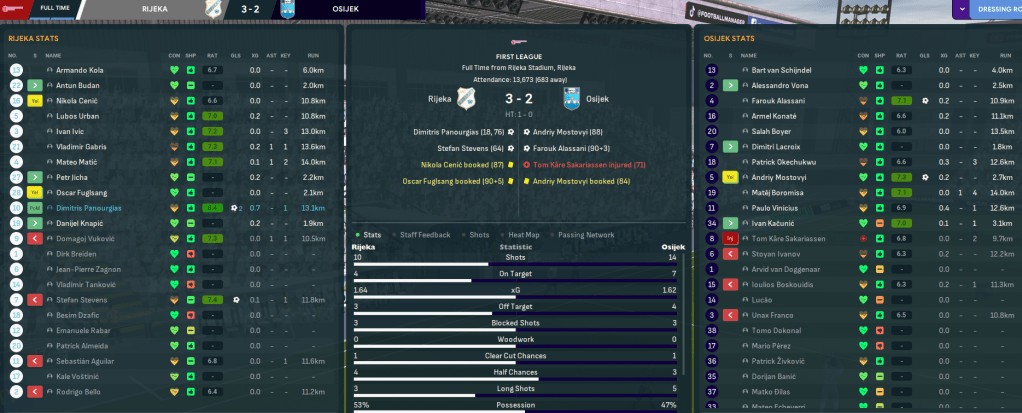 A big game in mid-December saw Rijeka host Osijek and struck the first blow as Vukovic sent Panourgias in to coolly finish. Osijek had more chances without creating anything overly threatening and Stevens punished them with a calm finish on 64 minutes before Panourgias doubled his tally with a powerful 20-yard strike. Osijek scored late on from a corner then got another to skew the nature of the match, but Rijeka claimed a huge victory to go into 2060 with an 8-point lead.