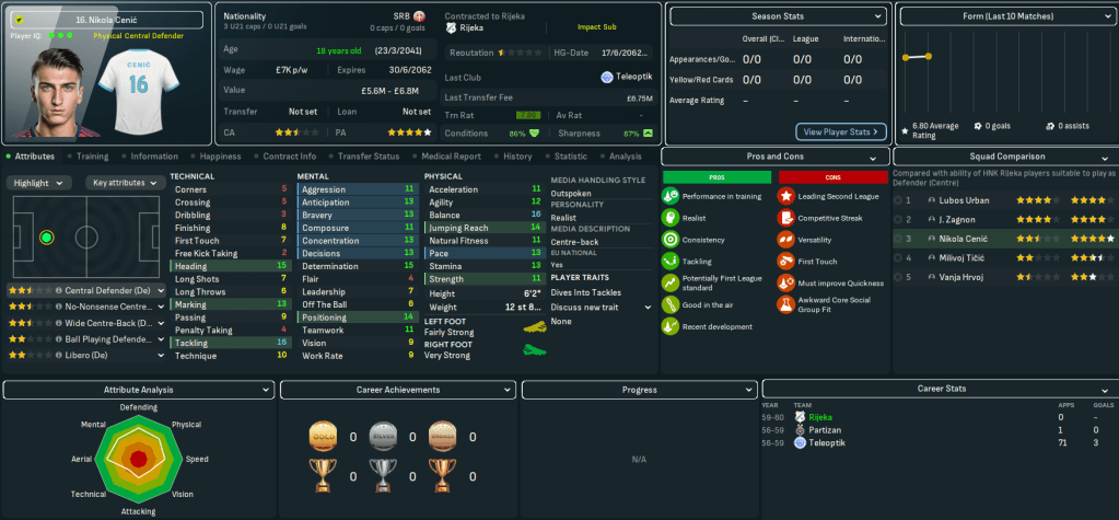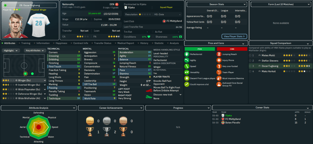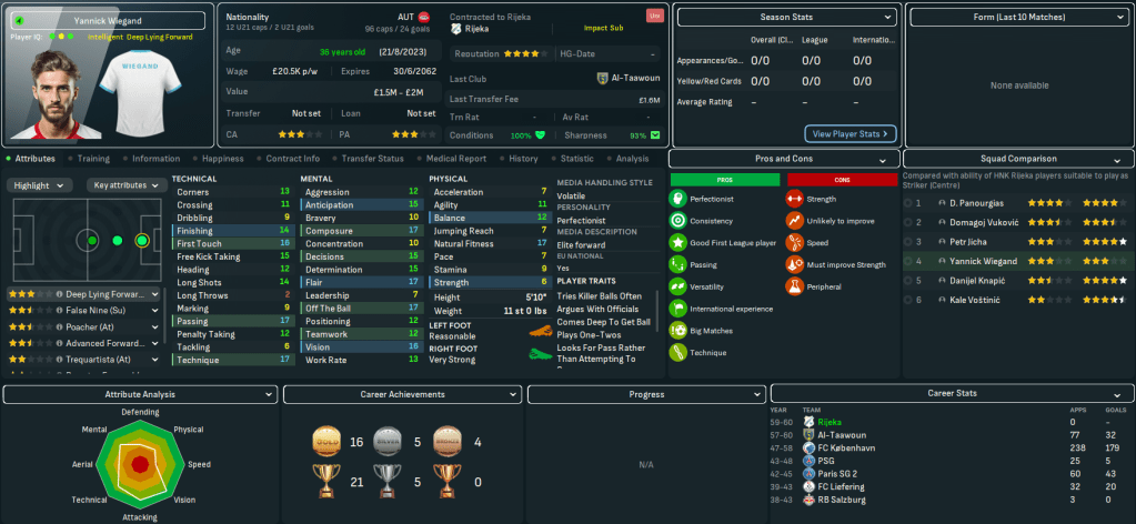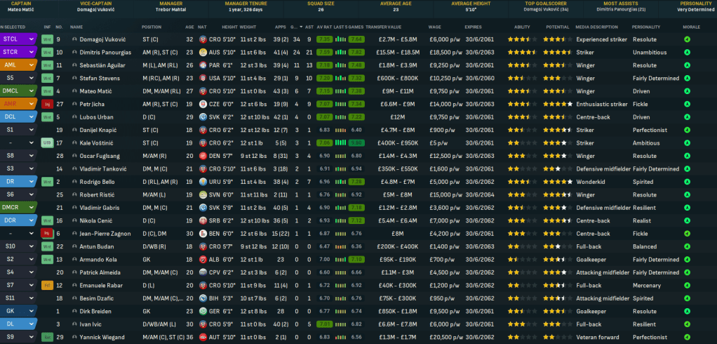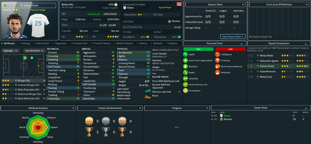 Mahtal was keen to add to his squad in January 2060, but largely struggled to find players through his scouts’ recommendations. So he took the matter into his own hands. The first player to arrive was a familiar one in his former Kobenhavn striker Yannick Wiegand, who aged 36 has declined physically but brings crucial experience to the club. He was joined by Slovenian left winger Robert Ristic for up to £5.5m from Maribor.