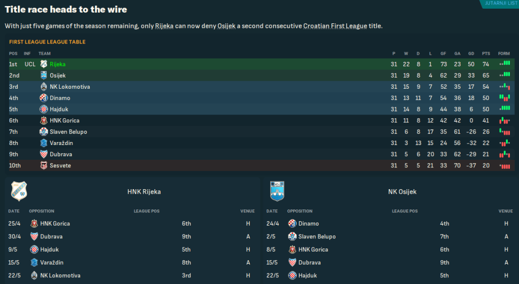 Rijeka backed that up by dominating Sesvete 3-0 then got the same result at home to Dinamo, who didn’t even manage a shot on target, and at Slaven Belupo thanks to Panourgias’ early goal and Vukovic’s second-half brace. Osijek kept pace thanks to a 93rd-minute winner at home to Lokomotiva, which kept Rijeka 9 points clear going into the final five games.