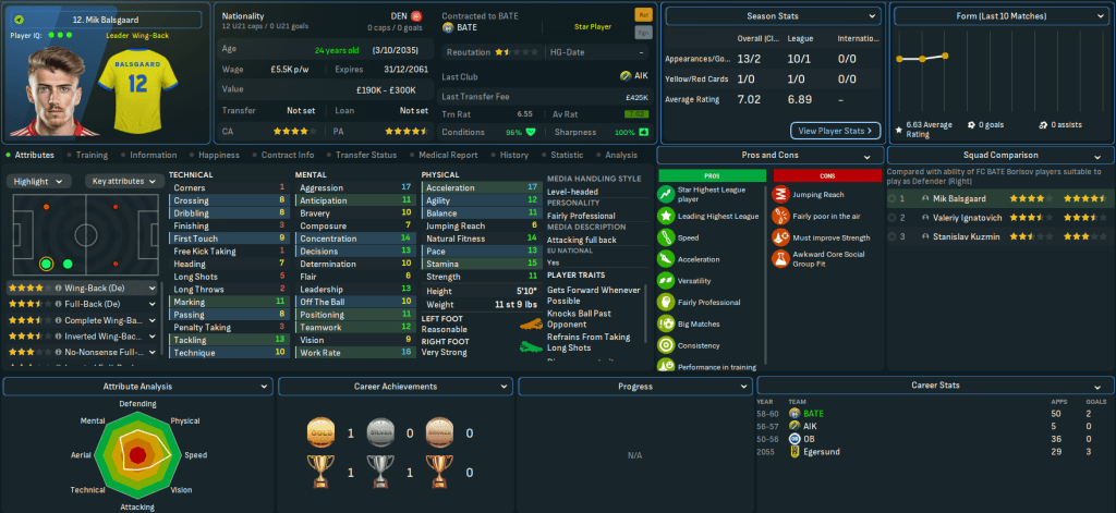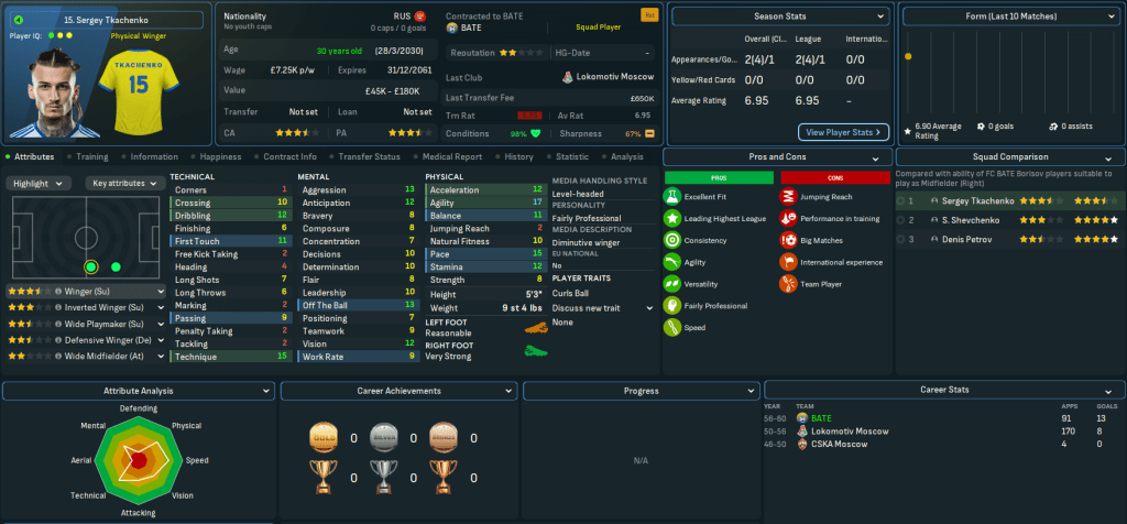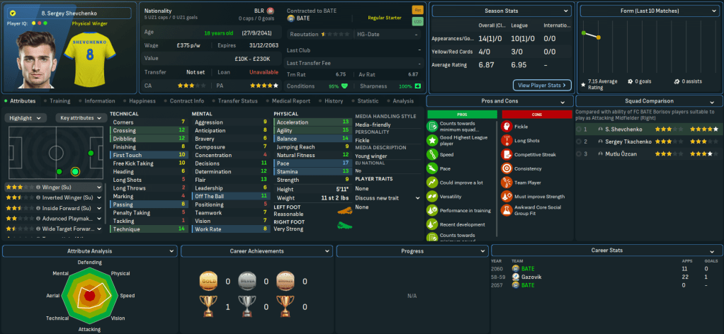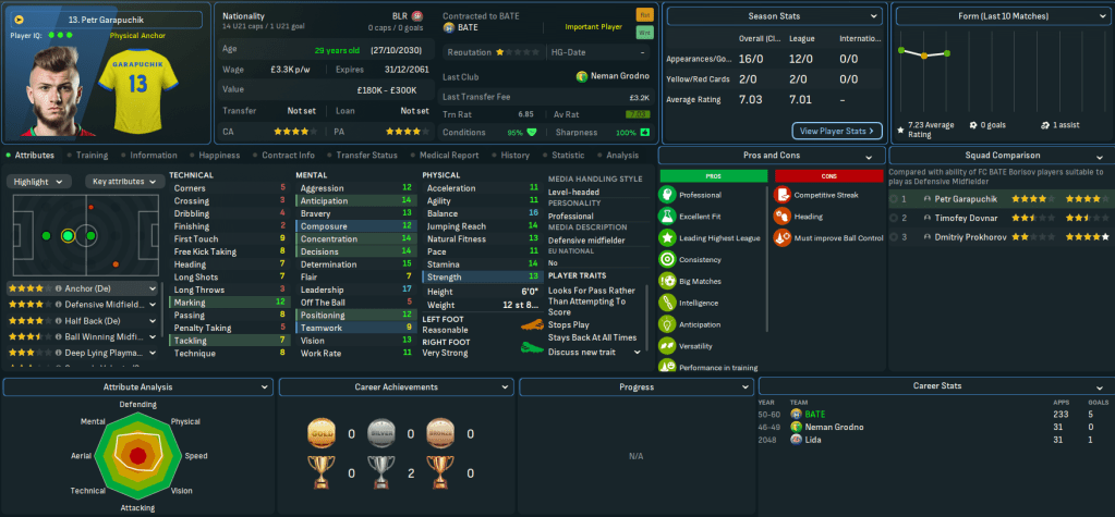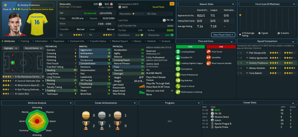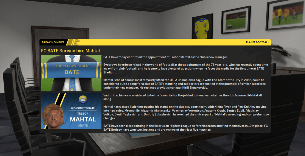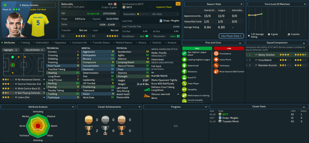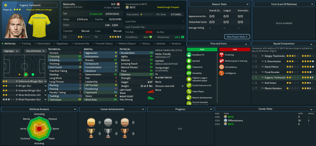 Mahtal’s successes left Belarus, Bulgaria, Gibraltar, Hungary, Iceland, Israel, Latvia, Northern Ireland and Poland as the only European nations he needed to conquer outside the big seven. A couple of interesting jobs were already available, one in Belarus and one in Poland, so Mahtal applied and was rapidly offered an interview and a vacant role by one of the clubs. He was more intrigued by the other vacant role, but that never materialised, so on 16 June 2060 Mahtal was headed for Belarus.