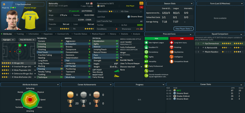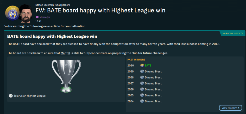 ФК БАТЭ Барысаў or FK BATE Borisov is a Belarusian professional club from the city of Barysaw. BATE – which stands for Borisov Automobile and Tractor Electronics – was founded in 1973 and managed to win Belarusian Soviet Socialist Republic league three times in the 1970s before being disbanded in 1984. It was reformed in 1996 and became the most successful Belarus club heading into this save with 15 domestic titles, including 13 consecutively between 2006 and 2018. BATE also won the first season of this save and again in 2029 but has only added one more in the last 31 years, back in 2048. Dinamo Brest have taken over, winning the last seven titles, 11 of the last 12 and 16 of the last 19.