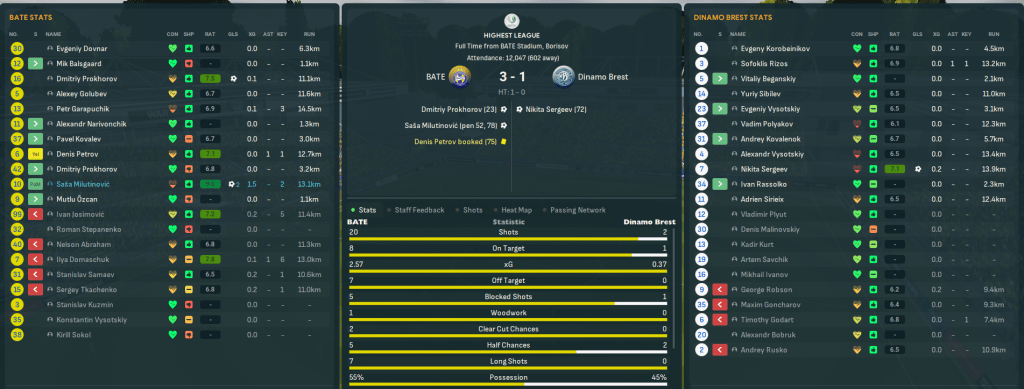 Mahtal was thrown straight into the toughest game in Belarus, a trip to holders Dinamo Brest. And his time in Belarus started well as Samaev curled into the top corner from a tight angle after half an hour. They had the better of the game with 13 shots to sven and 59% possession and just about held on for a vital 1-0 victory that moved them within 7 points of Brest in 3rd.