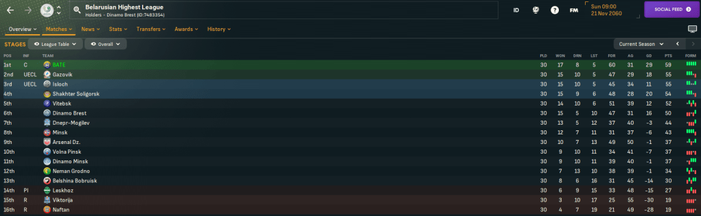 But his objectives were far higher, as a Belorusskoe klassiko victory over Dinamo Minsk left them just 2 points off the top of the table and in the heart of a seven-way title battle going into the final five games! Even Mahtal was taken aback by this sudden surge, which had been caused by Dinamo Brest dropping points in four of their last six games – largely fuelled by getting battered in the Europa League league phase every week – and Isloch dropping points in four of the last five.