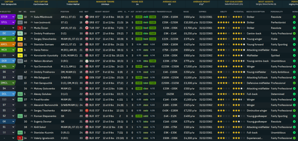 Mahtal couldn’t quite believe he’d led BATE to the Belarussian title. They’d been massively assisted by their rivals’ form falling apart, but a superb unbeaten run led BATE to their 19th title. Miltuibovic led the way with 23 goals in 41 games followed by Josimovic (14 in 24), Mtlu and Prokhorov (7) and Shevchenko (6). Shevchenko led the way with 9 assists followed by Garapuchik (8) and Milutinovic (7). And the club was also boosted by a strong youth intake boasting four 5-star potential talents.