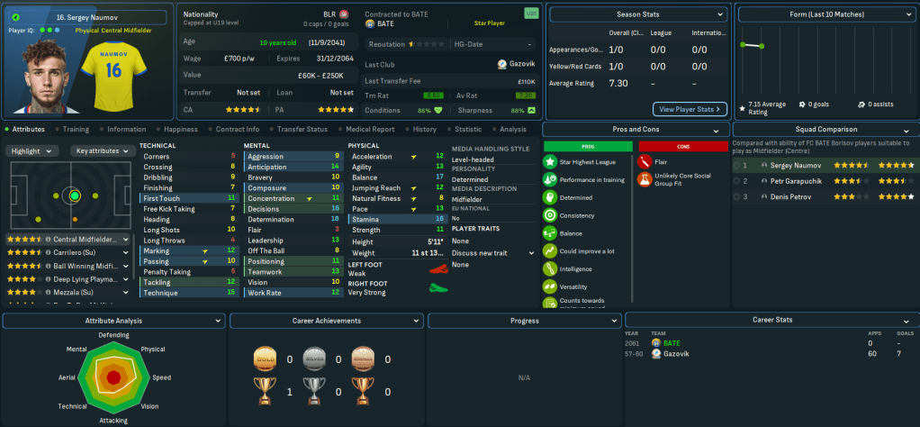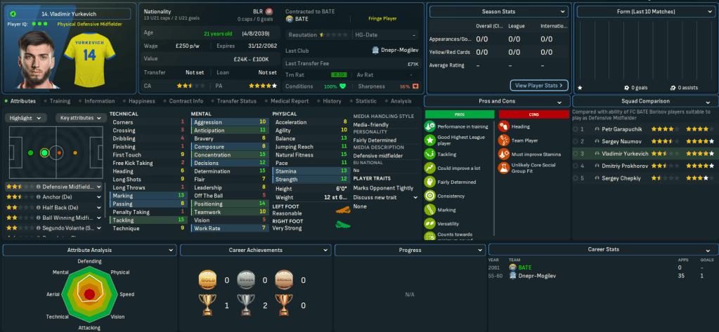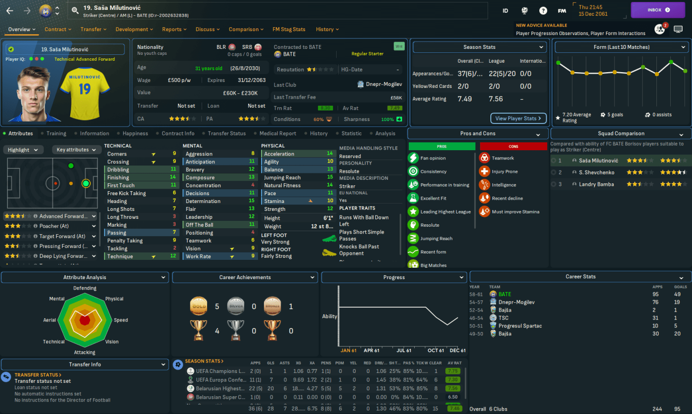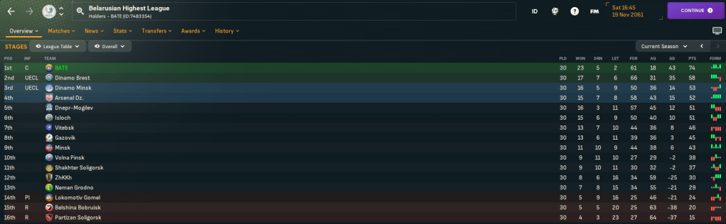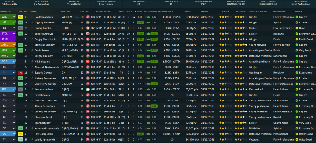At the ripe old age of 77 and with his contract expiring in December 2061, Mahtal decided that this latest success was probably a good time to depart BATE. Mahtal’s 25th role as a manager was highly successful, leading BATE into 78 games and winning 56, drawing 11 and losing 11, scoring 163 and conceding 68. Mahtal had now reached a total of 1,987 games in management and, having thought about retiring in the summer of 2061, decided to pursue one more role to pass the magical 2,000 games milestone.