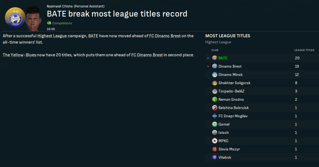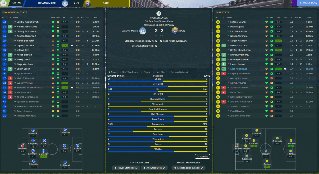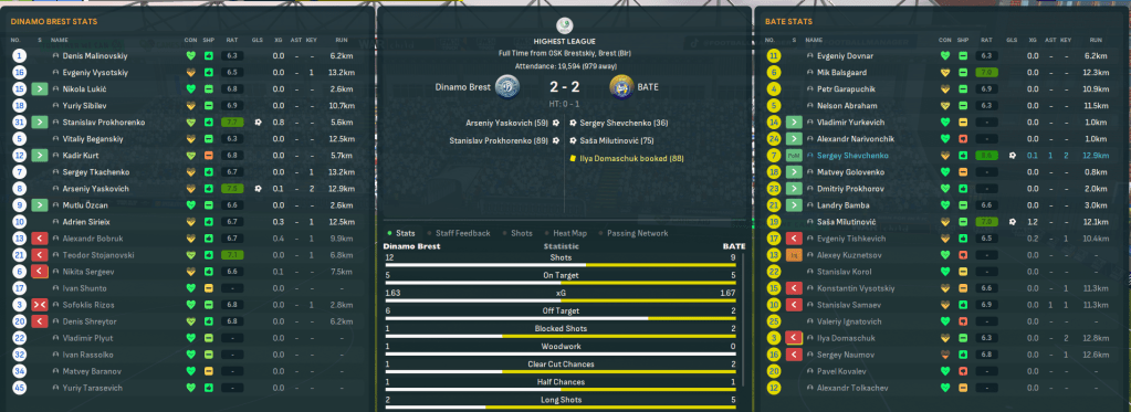 BATE went on to win the league by 16 points after 23 wins, 5 draws and just 2 defeats, scoring 61 and only conceding 18. Milutinovic was the top scorer with 20 in 27 and got the second-best average rating of 7.56. While Evgeniy Dovnar set a new league record 17 clean sheets, surpassing the 16 set by Dinamo Minsk’s keeper way back in 2023.