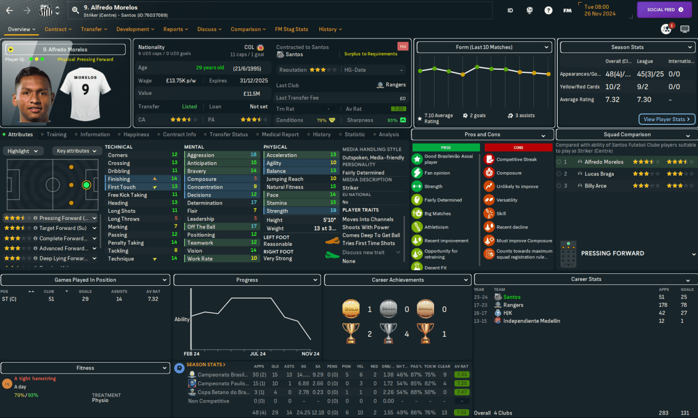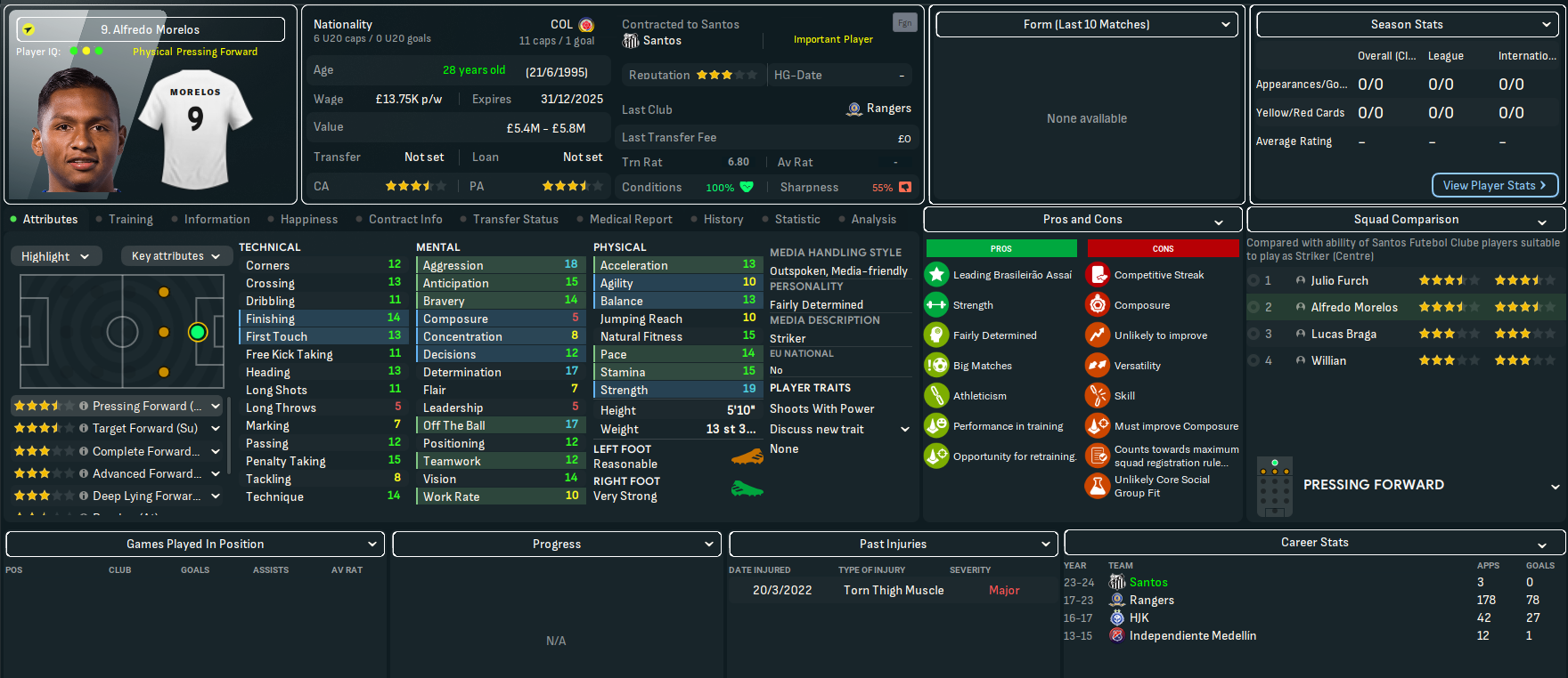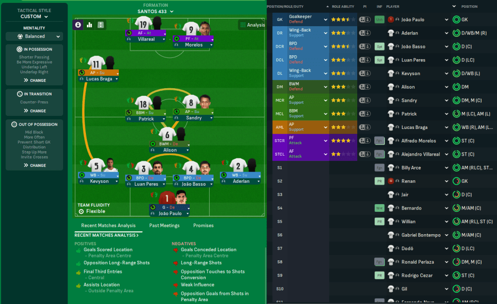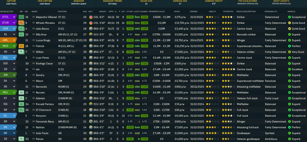 The best player at Santos will be a familiar name to Scottish football fans, former Rangers striker Alfredo Morelos. Other key players will be centre backs João Basso and Luan Peres, and homegrown goalkeeper João Paulo. They also had a mass of old players – so Lazaró sold 31 players for a profit of £3.3m to slash £125k off the wage budget. Slightly better news was they had a few players with potential, led by left back Kevyson and 6ft 6in centre back Jair.