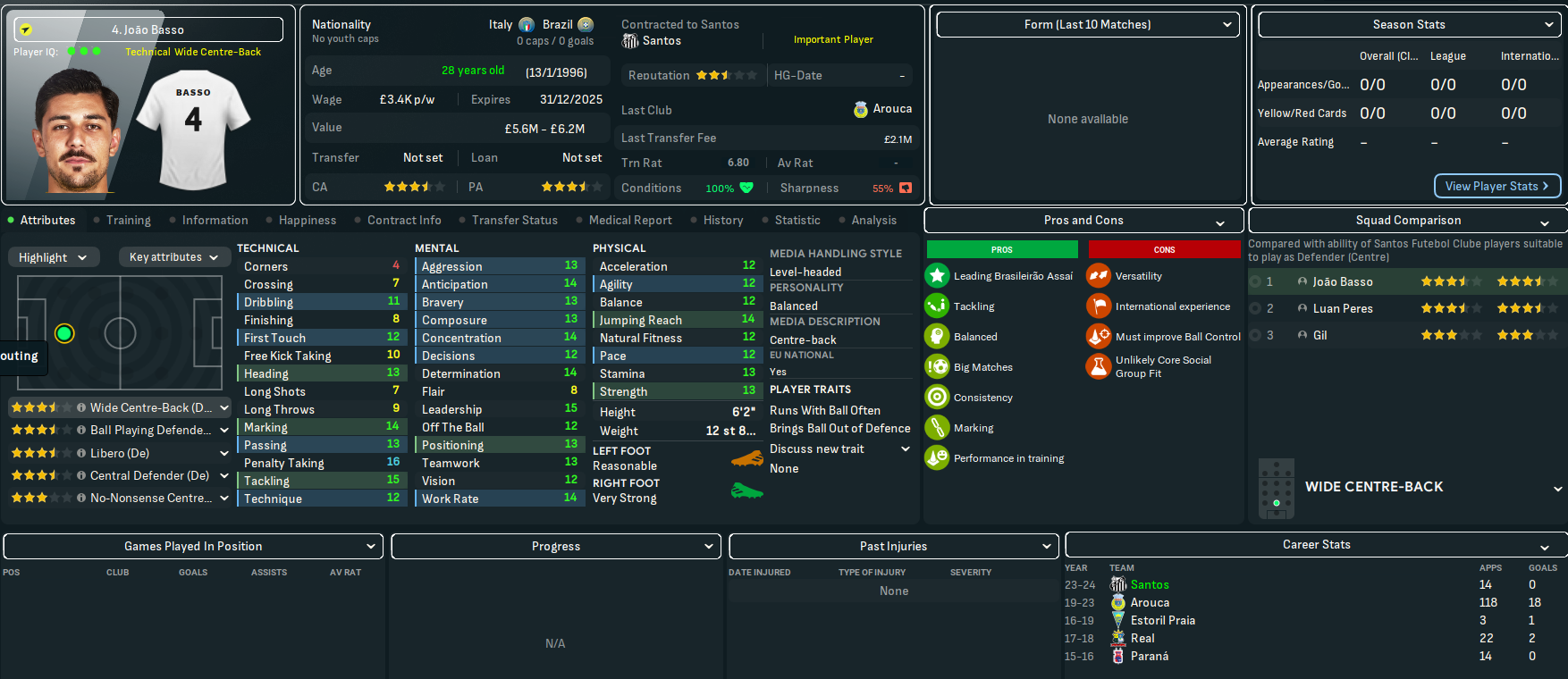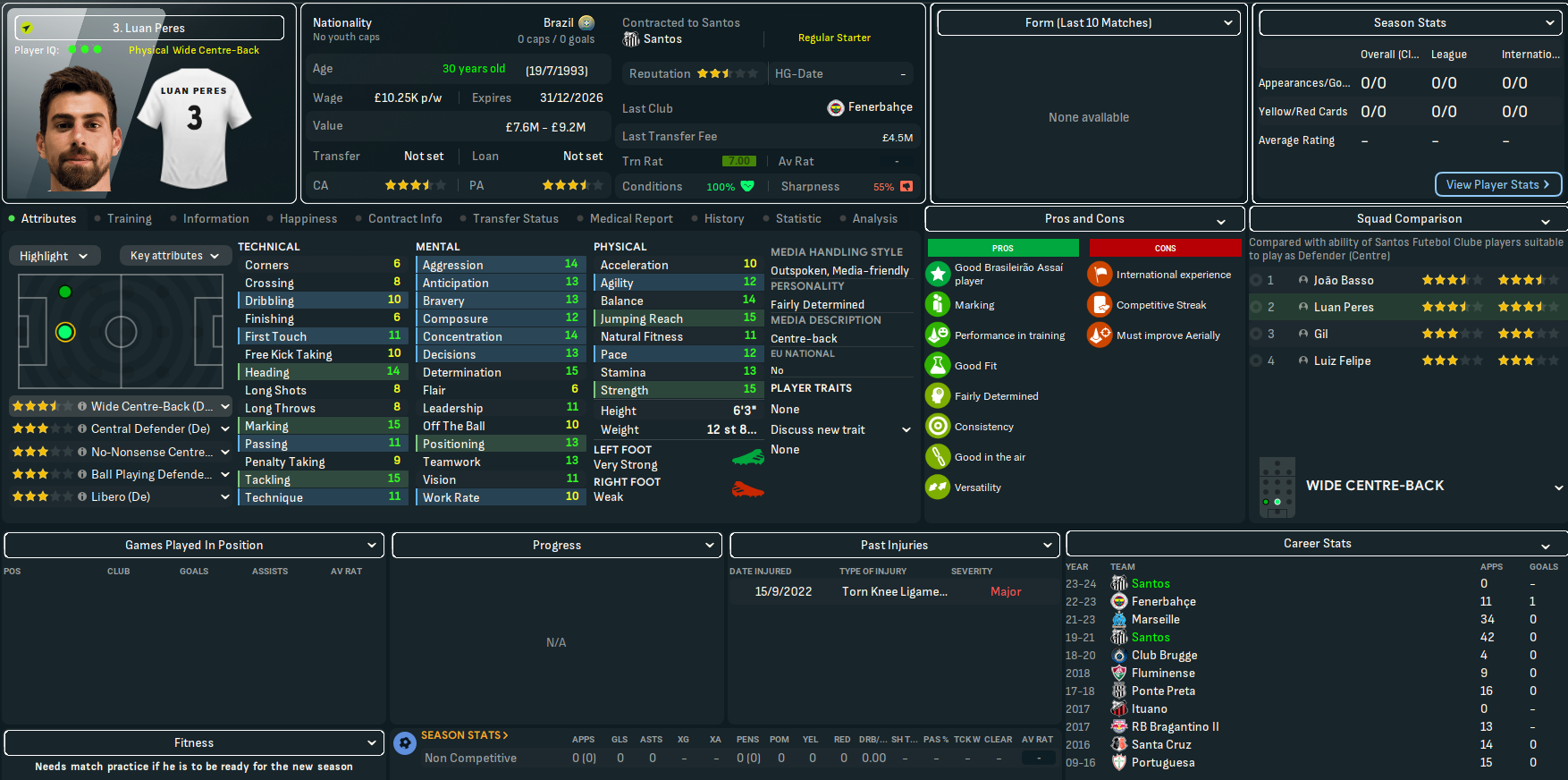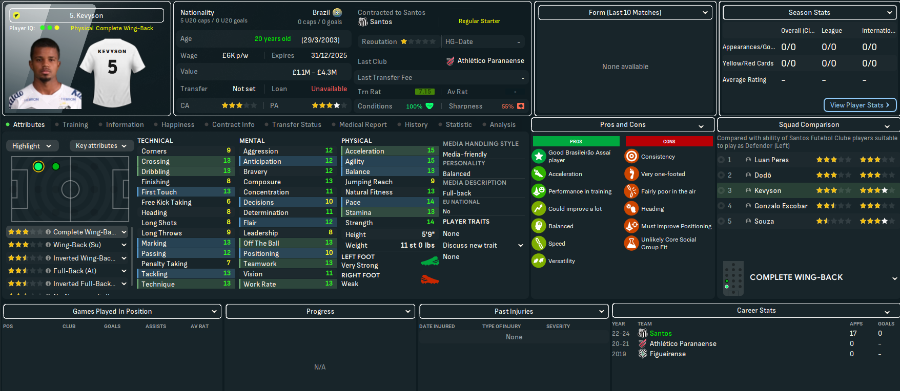 The best player at Santos will be a familiar name to Scottish football fans, former Rangers striker Alfredo Morelos. Other key players will be centre backs João Basso and Luan Peres, and homegrown goalkeeper João Paulo. They also had a mass of old players – so Lazaró sold 31 players for a profit of £3.3m to slash £125k off the wage budget. Slightly better news was they had a few players with potential, led by left back Kevyson and 6ft 6in centre back Jair.