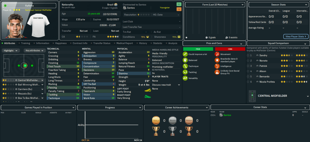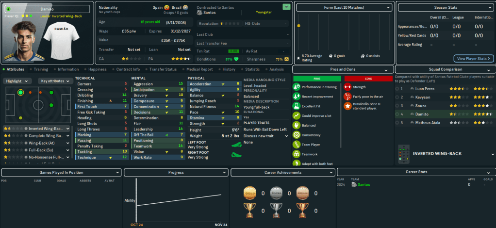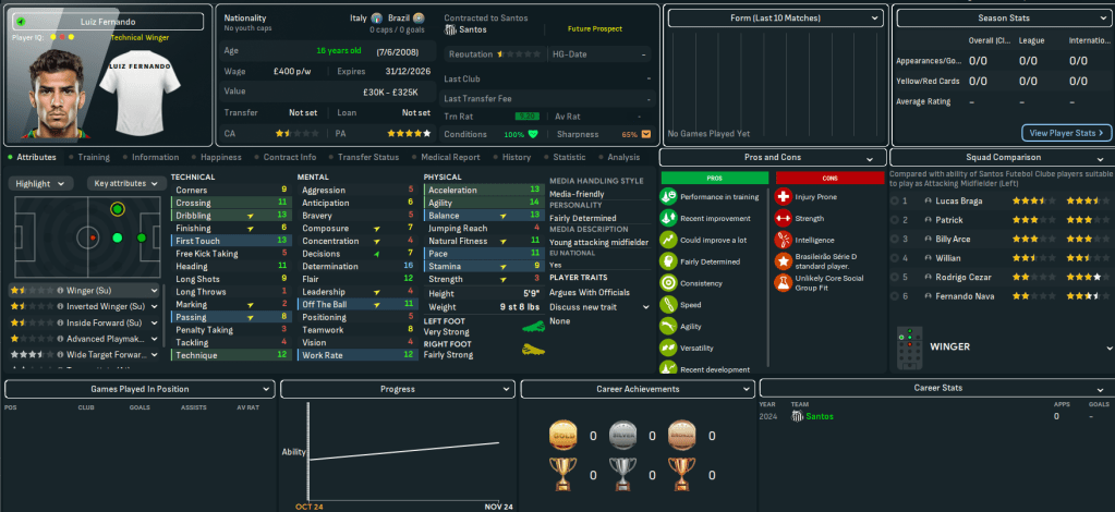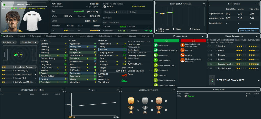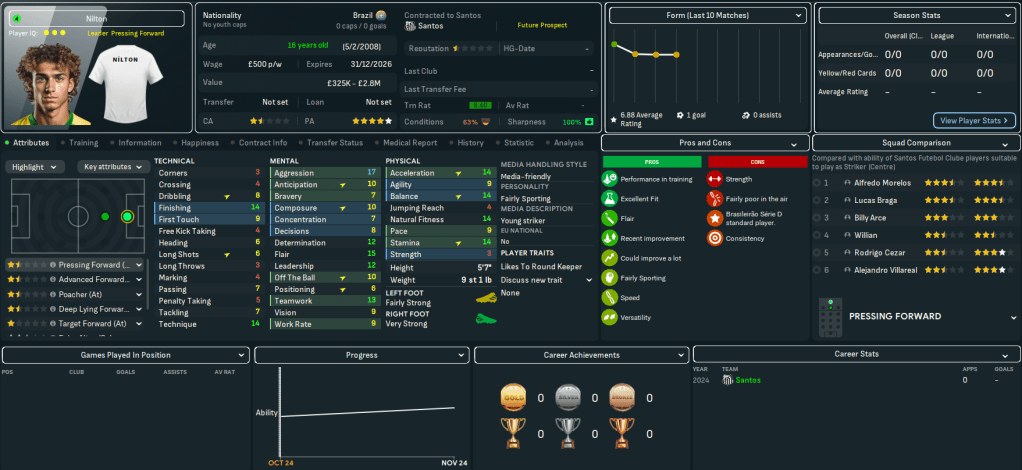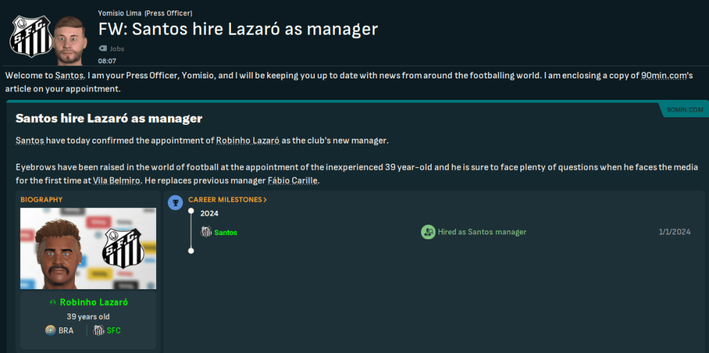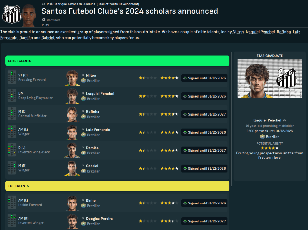 So, while this isn’t strictly a youth-only challenge, we will implement the Ginga factor to try and develop Santos’ next world-beating homegrown talent. This is highly likely to be reliant on newgens but, in addition to focusing on our own talents, we’ll scour South America for talent to help us lead Santos back into the top tier, become the best team in Brazil and make it South American champion for the 4th time. For now, the Santos board expects automatic promotion at the first time of asking, then for us to work towards challenging for the Série A title by 2026. Which is pretty ambitious.