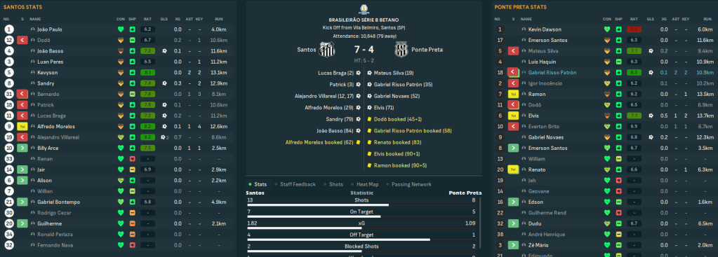 Santos’ maiden season in Série B began with a heavily rotated team suffering a shock 2-1 defeat at home to Amazonas. But the first 11 returned to thrash Operário 4-1 away led by veteran right back Aderlan’s hat trick of assists before Morelos scored the only goal at CRB. A tricky week followed, starting by entertaining Recife and battering them 5-0 led by braces from Morelos and midfielder Patrick. A few days later, they went to Coritiba and winger Lucas Braga’s goal after 25 seconds earned a 1-1 before an entertaining 2-2 at home to Goiás and a 1-1 at Mirassol. But they got back to winning ways with a wild 7-4 win over Ponte Preta, in which they led 5-1 inside half an hour.