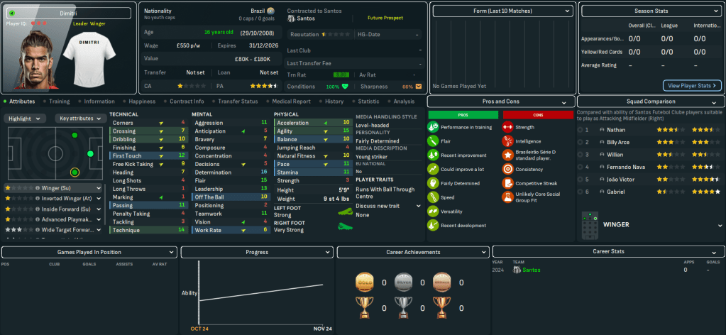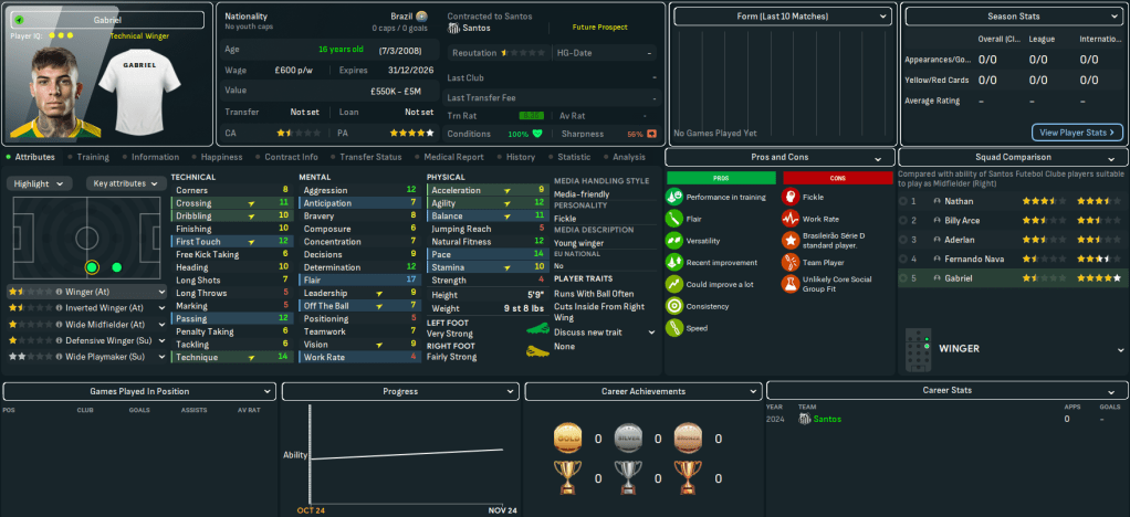 One of my inspirations for this save was MikaelinhoFM’s superb Santástico series on FM20. In this series, he went in search of “the next Neymar” by developing young stars that personify the art of Ginga or “o jogo bonito” – “the beautiful game” or playing “the Brazilian way.” I want to bring an element of that ethos into our Salvando Santos mission, focusing on homegrown talents that could be the next Neymar or Pelé. To do that, Mikaelinho focused on core values that demonstrated his youngsters’ talents: