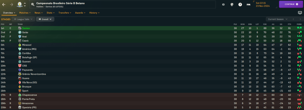 Santos came into Campeonato Brasileiro Série B Betano as massive 1/91 favourites to achieve promotion, ahead of Coritiba (11/4), Goiás (7/2), Sport Club do Recife (5/1) and América MG (6/1). The top 4 teams in Série B are promoted automatically, but are no playoffs.