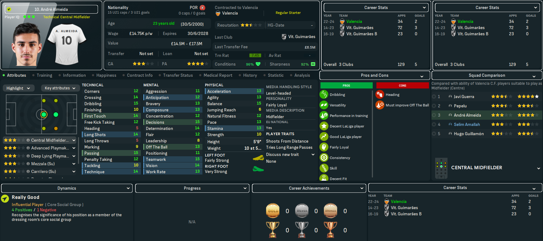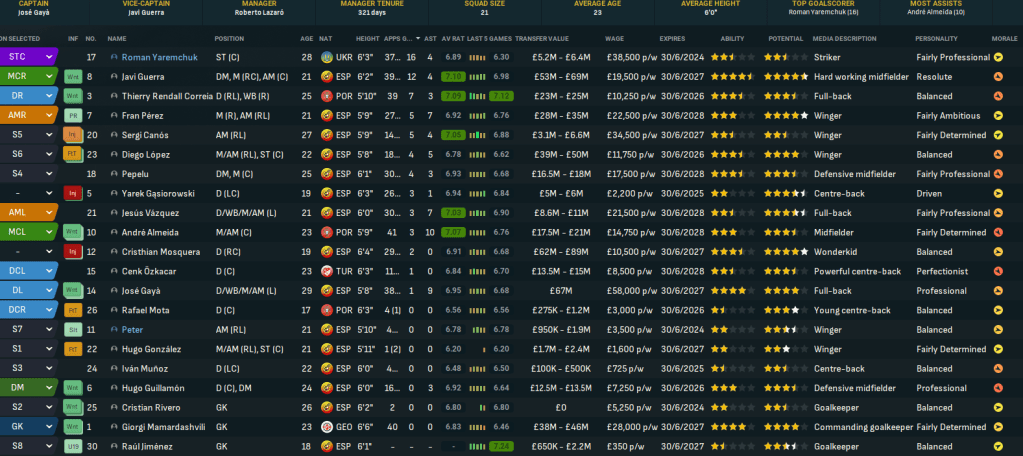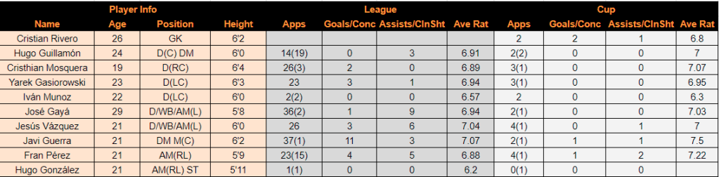 Yaremchuk topped the scoring chart for Valencia with 16 in 39 but was terrible at the end of the season. Also impressive were Guerra with 12 goals and 4 assists, Correia with 7 goals and 3 assists, Pérez with 5 goals and 7 assists, Almeida with 3 goals and 10 assists and Gayá with a goal and 9 assists.