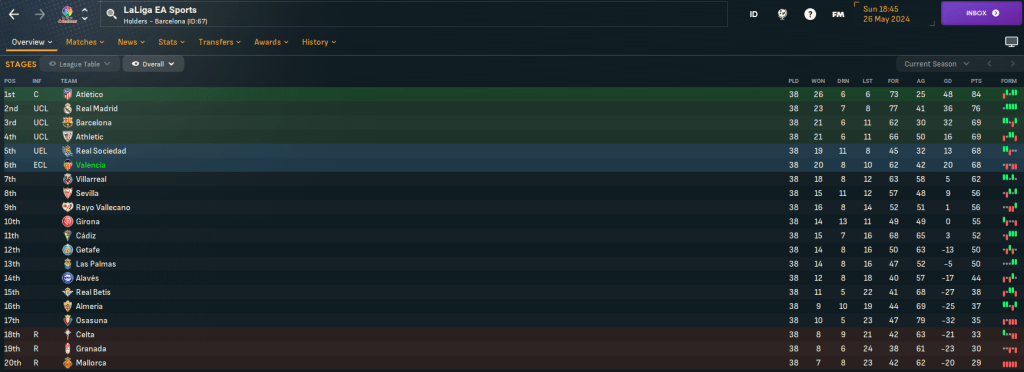 A defensive injury crisis hit at the end of the season and Valencia failed to win any of their final 6 games, dropping them from 2nd to 6th – which realistically, was probably a blessing in disguise. They eventually finished with 68 points, only 1 point off Barca in 3rd, after 20 wins, 8 draws and 10 defeats, scoring 62 and conceding 42.