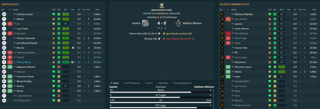 Santos finished 8th with 59 points after 17 wins, 8 draws and 13 defeats, scoring 66 and conceding 54. The league saw two big shocks as 2023 Libertadores winners Fluminense and 2021 Brazilian champions Atlético Mineiro were relegated. But the biggest news was Henry winning Rei do Gol with 20 goals in 37 games, scoring 3 more than Enner Valencia. While Soteldo was named Best Foreign Player and Craque do Brasileirão – Melhor Meia (Brazilian star – best attacking midfielder), Zanocelo won Melhor Volante (best midfielder), and Nathan won Melhor Lateral-Direito (best right back).