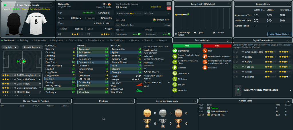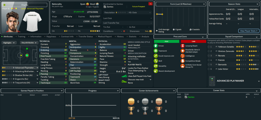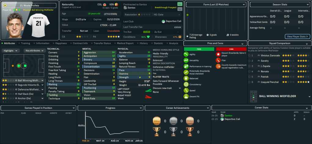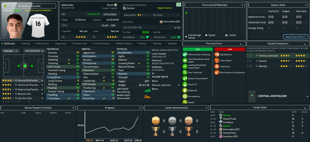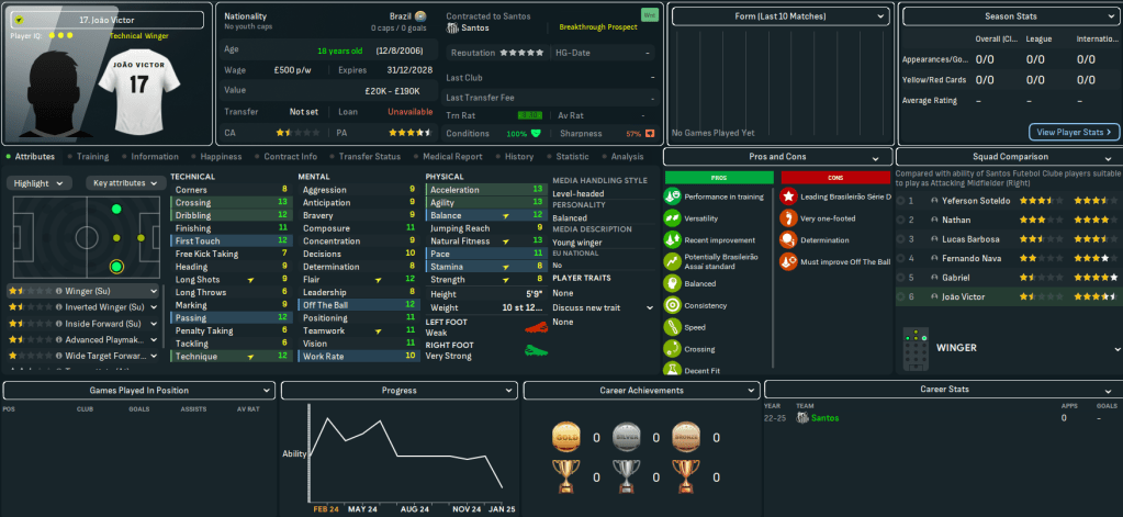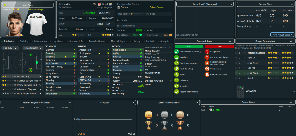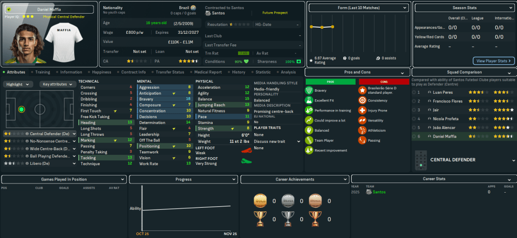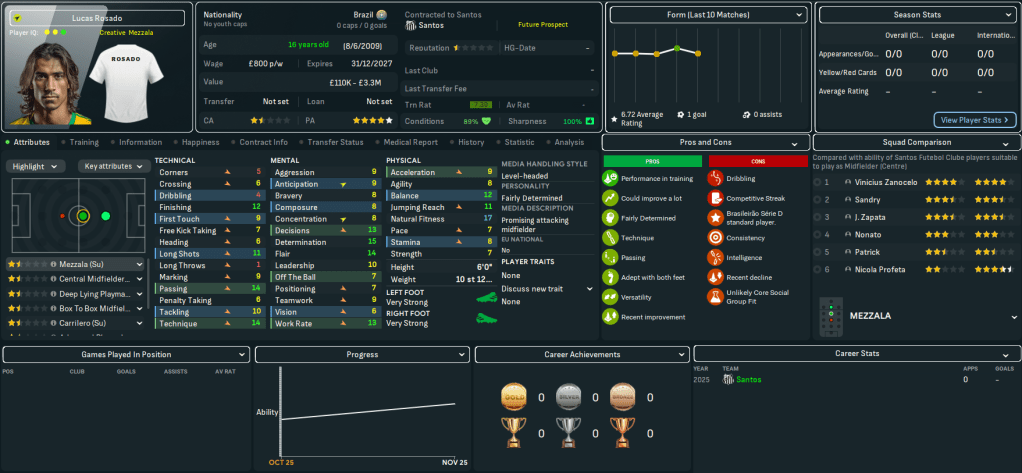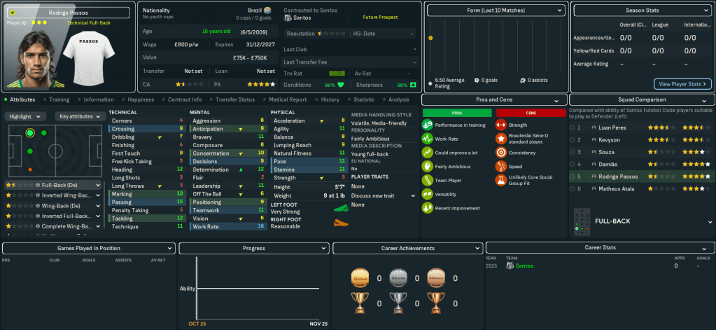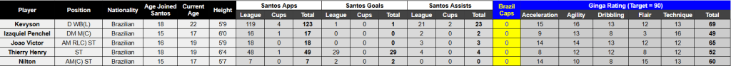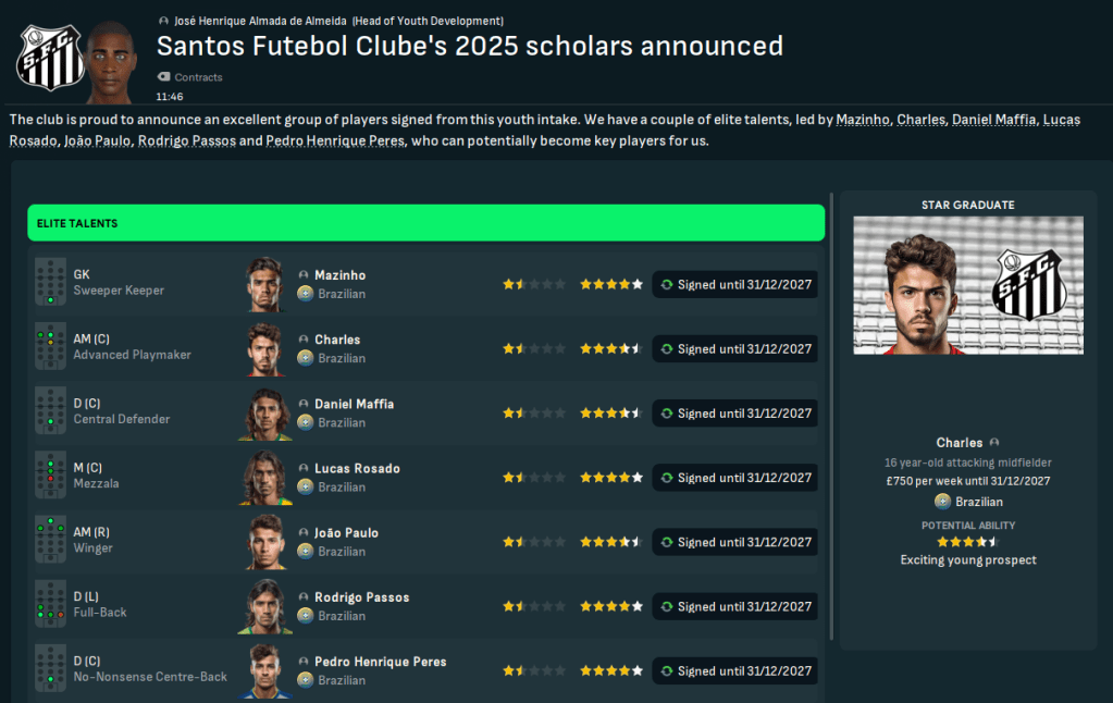 In addition to the on-field achievements, Santos fans had a “golden generation” to get excited about. Lazaró’s second youth intake delivered 4 players with 5-star potential, 2 with 4.5-star potential and 5 with 4-star potential. The best new talent, contrary to the head of youth development’s opinion, was goalkeeper Mazinho, along with midfielders Lucas Rosado and Charles, left back Rodrigo Passos, centre backs Pedro Henrique Peres and Daniel Maffia, and winger João Paulo.