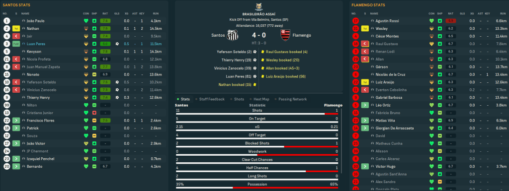 Santos’ positive start meant they were well clear of relegation – with a 15-point gap to the dropzone. Lazaró’s new mission was to secure a top-13 place and qualify for at least Copa Sudamericana. And the second half of the season began with two huge statement wins. First, they went to Palmeiras, dominated by 24 shots to 8, and won 2-0 through a Soteldo penalty and Henry’s header. But arguably even better than that was hosting Flamengo, having 11 shots to 1 and scoring 4 through Soteldo, Henry and Luan Peres headers and Zanocelo’s neat finish. Santos suddenly found themselves 2nd (albeit having played 4 more than many teams around them) and had their fans dreaming.