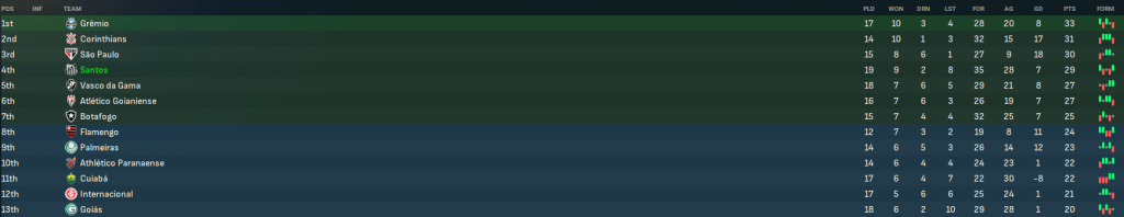 Lazaró celebrated his new deal with Penchel getting his first career assists for Nonato and Henry in a 2-1 win at Vasco before Zapata’s pair of long-range strikes and a Zanocelo assist hat trick earned a 3-1 win at Fortaleza. A defeat followed at home to Gremio, but a really exciting moment saw youth product Nílton bag his first two goals in a 4-1 win at bottom-side Cruzeiro. Their form dropped off a little, but Santos found themselves 4th after 19 games, undoubtedly skewed by other team’s continental commitments.