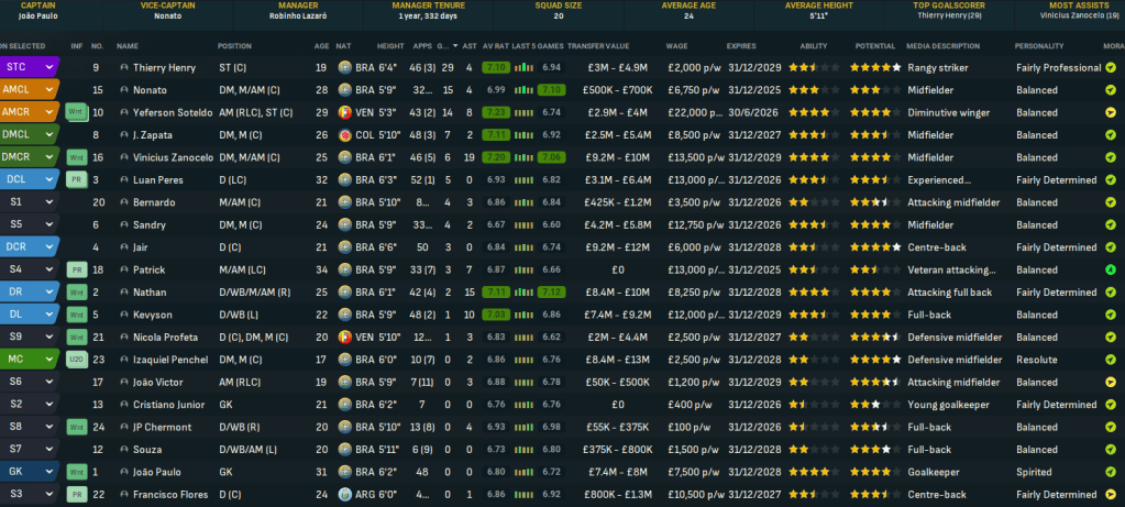 Two years on from relegation, Santos were very much a club on the rise having secured promotion then a top-half finish. This season’s star man was undoubtedly Henry, who scored 29 in 49, along with Nonato’s 15 goals and 3 assists, Soteldo’s 14 goals and 8 assists, Zanocelo’s club-high 19 assists with 6 goals, Nathan’s 15 assists, left back Kevyson’s 10 assists and Zapata’s 7 goals.