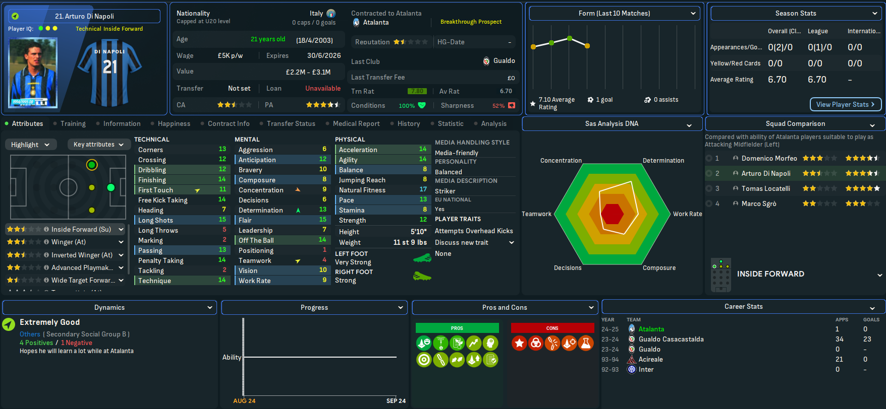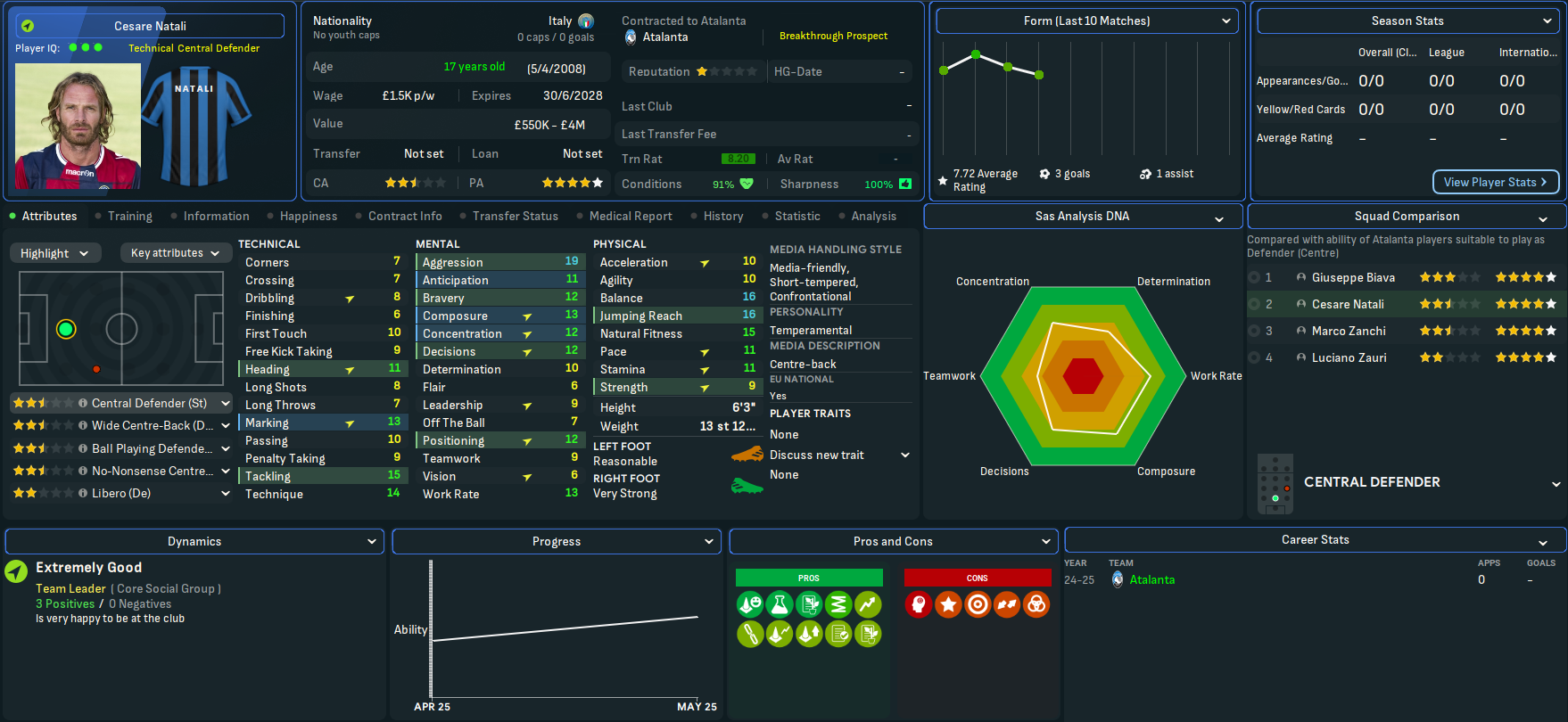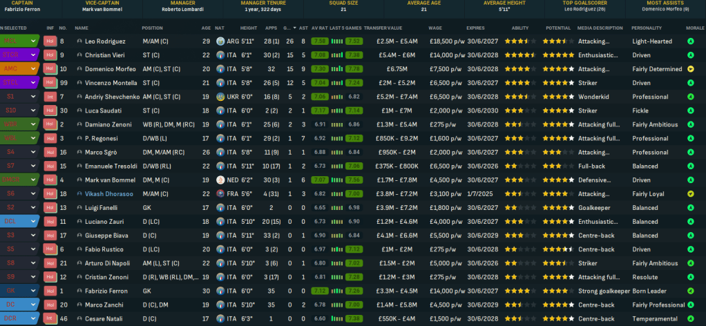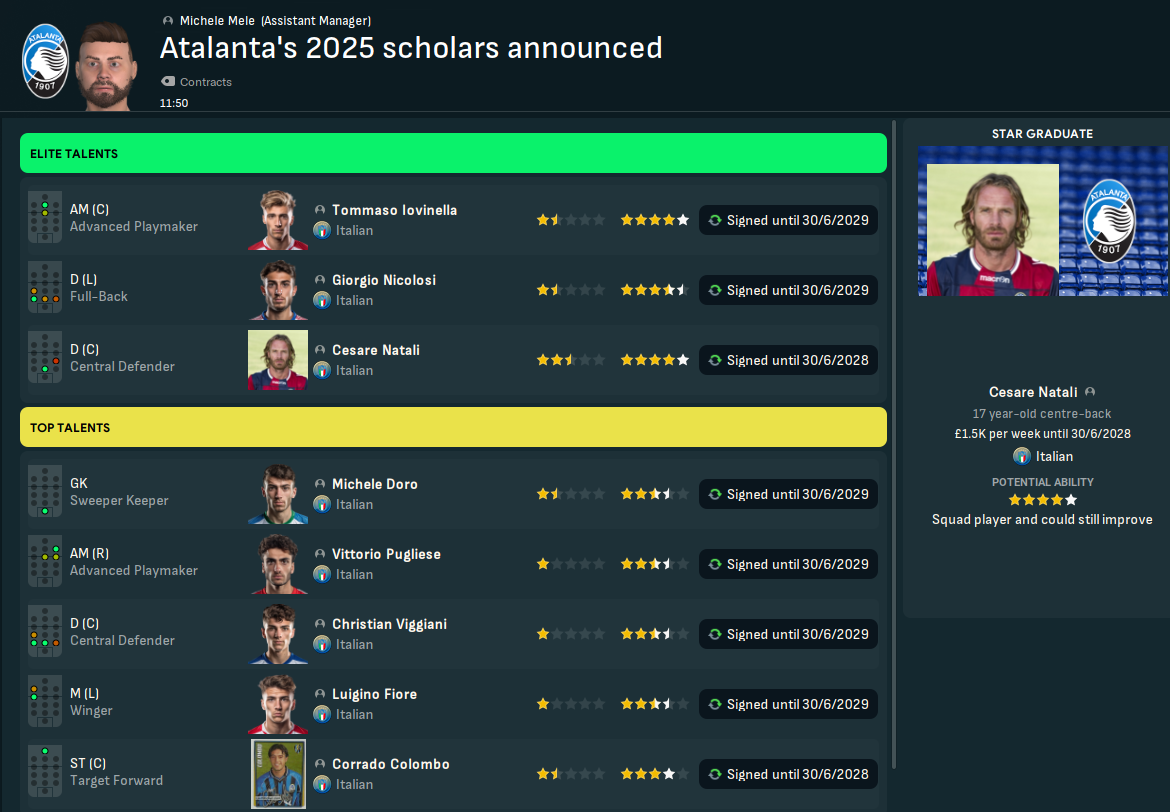 The second youth intake was led by 5-star potential centre back Cesare Natali, who’s gone straight into the first team and played 330 league games for the likes of Udinese, Torino, Fiorentina and Bologna in real life. It also featured real-life midfielder Corrado Colombo, alongside exciting newgens midfielder Tommaso Iovinella and Giorgio Nicolosi.