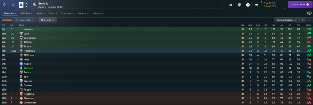Those big wins saw Atalanta close in on the trio of Roma, Inter and Napoli as they finished 10th with 54 points. They won 16, drew 6 and lost 12, scoring 72 and conceding 58. A ridiculous Juve side defended their title, scoring a remarkable 131 goals – that’s 3.85 goals per game! Rodriguez finished as the 6th top scorer in Serie A with 22 in 28, 5 behind Klinsmann (27 in 27), and Vieri was 15th with 15 in 31. While Ferron kept the joint-4th most clean sheets with just 8 in 34, which was only 4 behind Peruzzi’s 12.