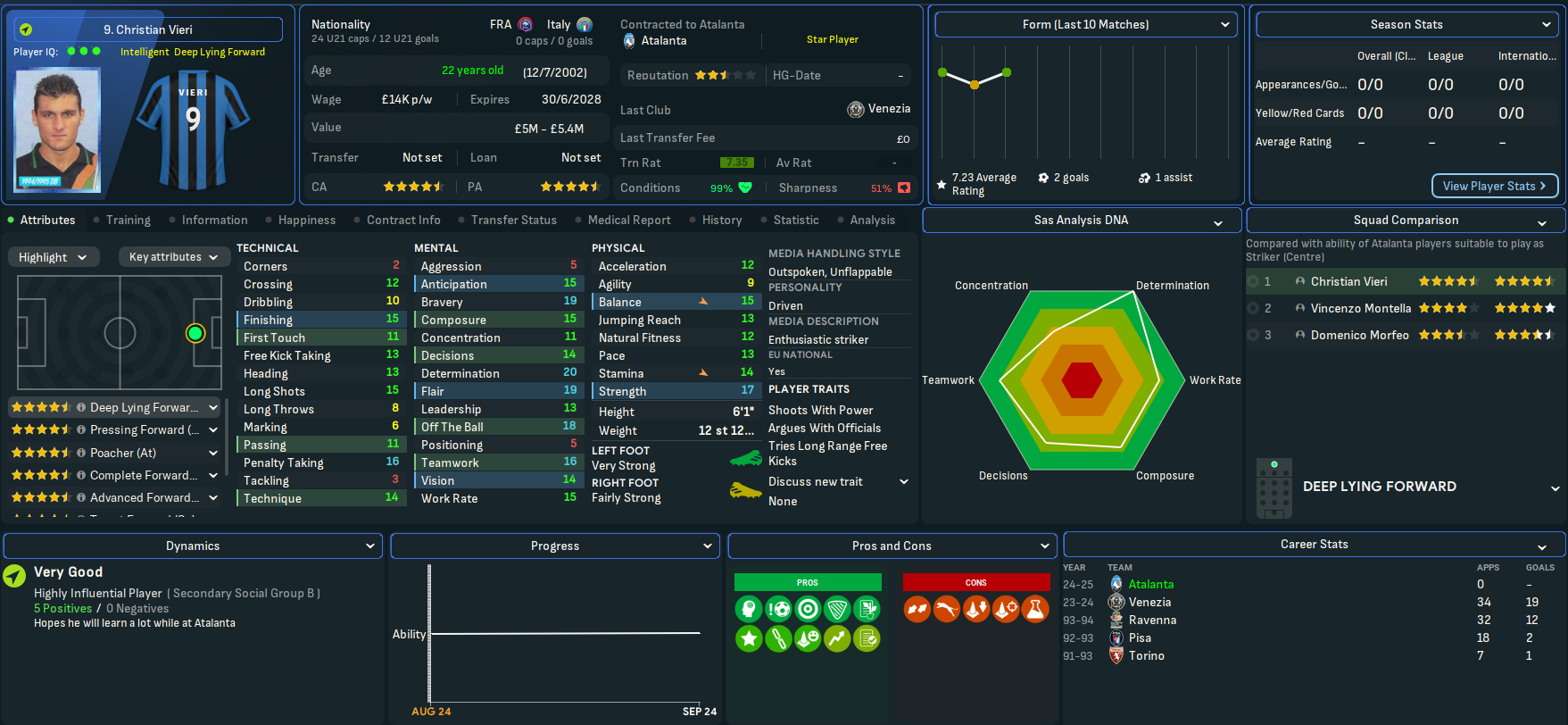 A young Atalanta side was very much mixing it with the big boys, exceeding expectations in their first season in Serie A with an average squad age of just 21. And Lombardi’s performance led the Atalanta board to hand him a new 4-year contract on £18,500 per week. The incredible Rodriguez led the way with 26 goals and 8 assists in 29 games from central midfield. Vieri scored 15 in 32, Morfeo got 15 goals and 9 assists in 32 and Montella got 12 in 31 but Sheva struggled a little with just 5 goals in 24.