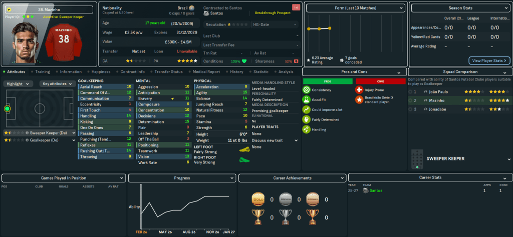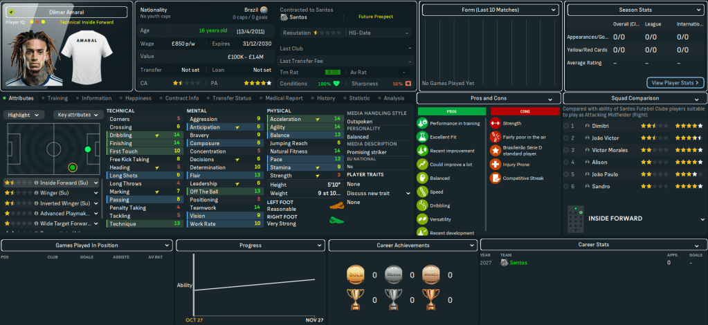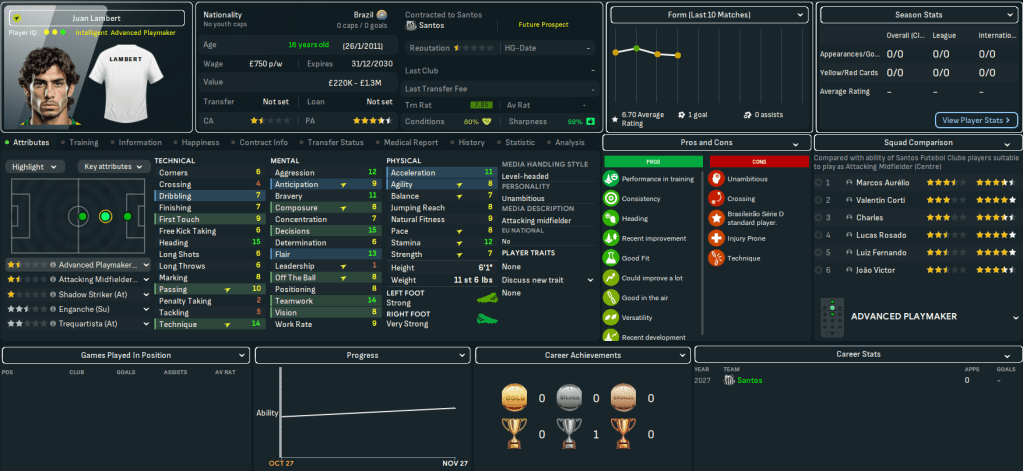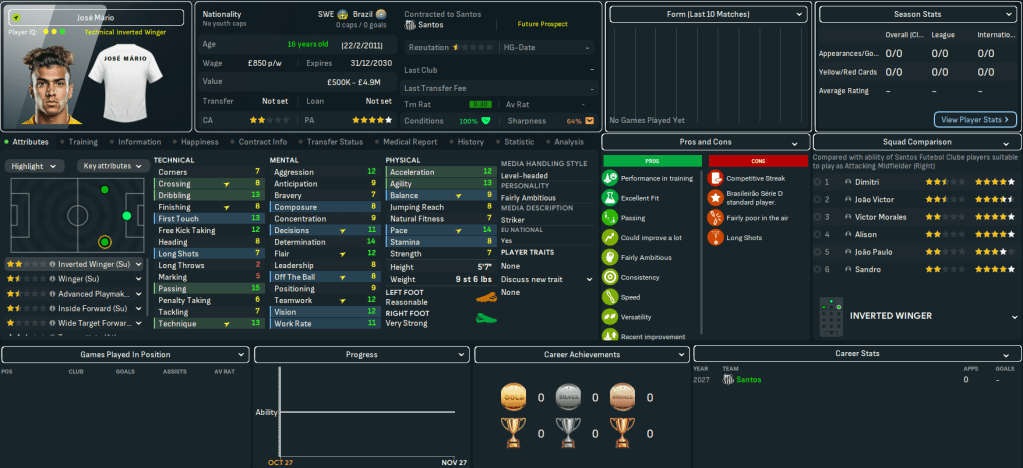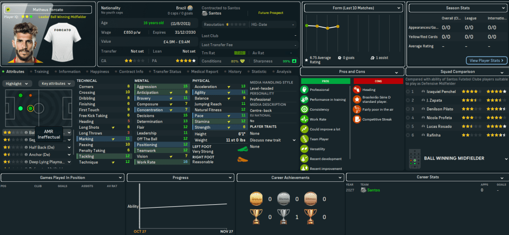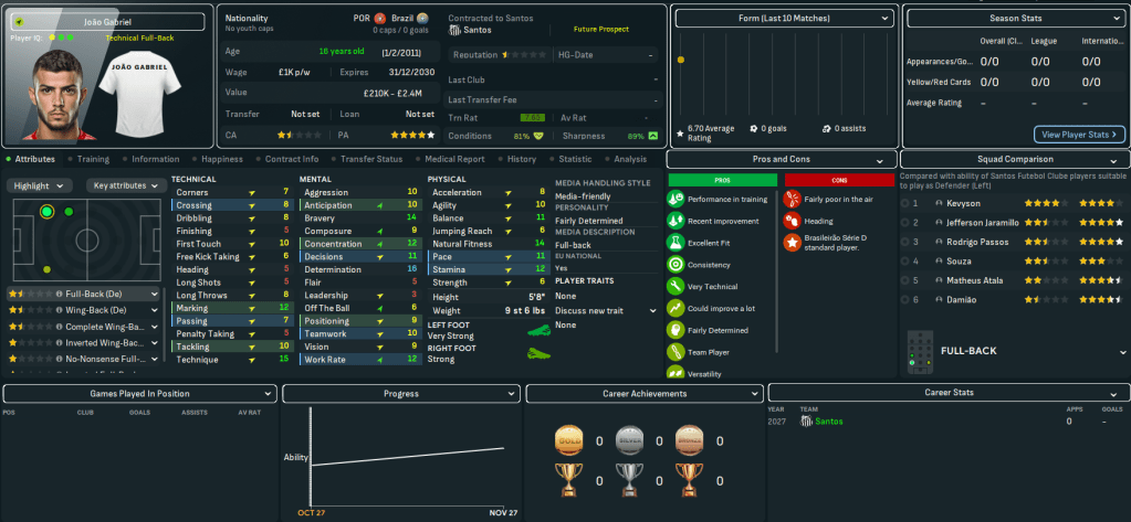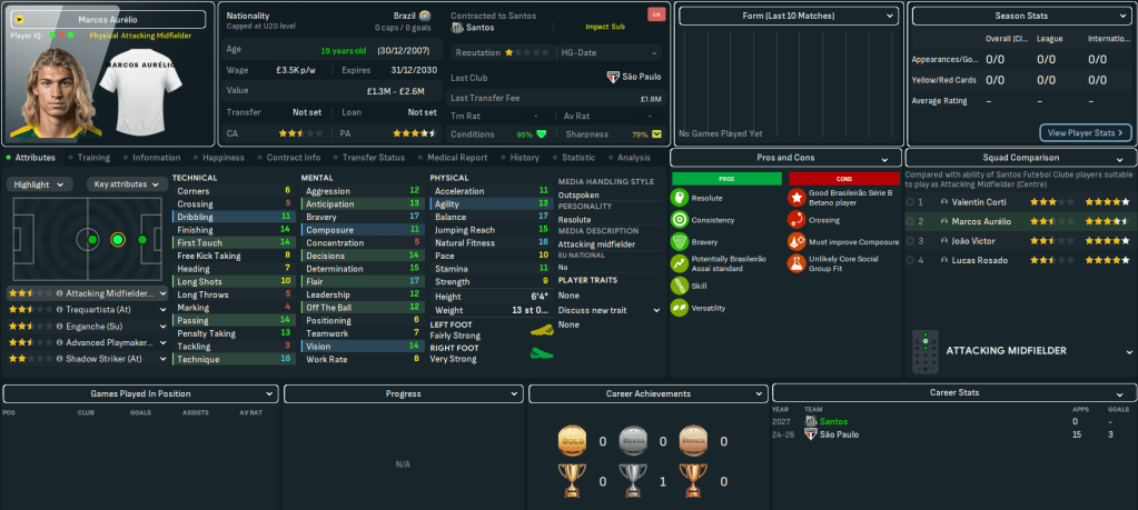 There continues to be a huge amount of potential at Santos, with the club now having 21 players with 5-star potential, 16 with up to 4.5-star potential and 14 with up to 4-star potential, which, for reference, is considered a leading Série A player. And they continue to make progress on the pitch, racking up their best league finish under Lazaró this season.