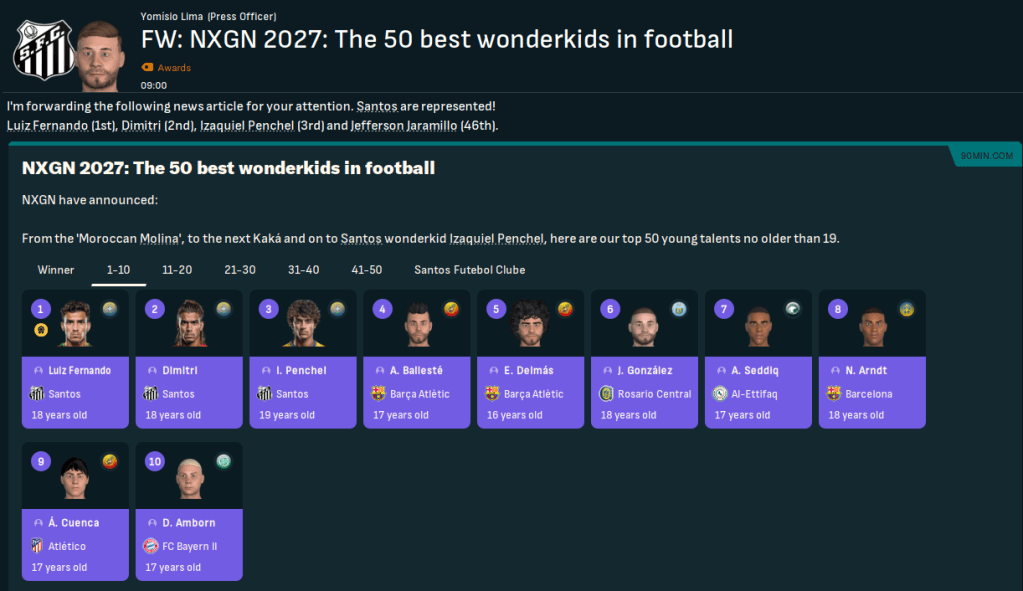 The Santos youth potential continued to deliver, again claiming the top 3 places in NxGn 2027. Fernando, who’s been dubbed “the next Kaká,” led the way ahead of Dimitri and wonderkid Penchel with right back Jefferson Jaramillo in 46th. Not content with that, Henry defended the Kopa Trophy ahaed of Fernando and Aurélio.
