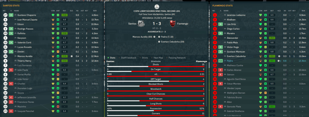 A tight second leg saw Flamengo waste chances in the first half before Aurélio missed a penalty. Santos grew into it after the break and claimed a huge victory as Henry nodded the ball down to Charles to smash a half volley into the top corner. However, they fell apart in the home leg, conceding to Flamengo’s first two shots and another just before halftime. Lazaró hooked goalkeeper Joao Paulo and switched to 2 up top, which saw Aurélio get one back but, despite pushing for another, they just fell short. And Lazaró immediately transfer-listed Paulo. Flamengo went on to lose 2-1 to River Plate in the Final.
