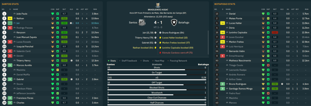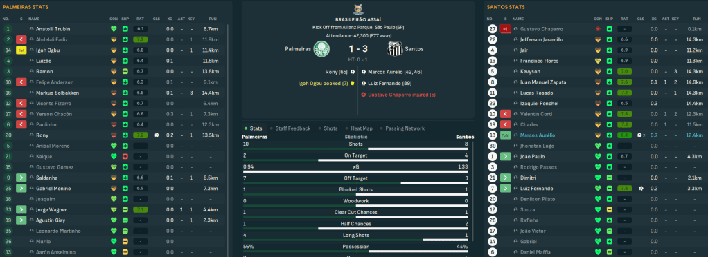 Moving on from that chaos, Santos got battered again at Corinthians. But Corti nicked a 1-0 at CRB to leave them in 2nd place well behind runaway leaders Palmeiras. Santos struggled to maintain their form around the big continental games, drawing 5 out of 7 in August. But a week off worked wonders as Aurélio’s brace either side of halftime earned a famous 3-1 win at leaders Palmeiras. However, they remained 12 points behind their rivals and dropped to 6th with 10 games remaining.
