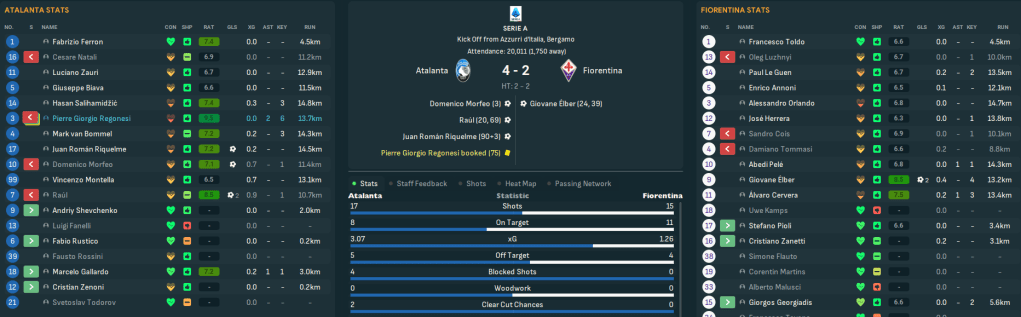 Atalanta had a really tricky start to the season, losing 2-0 at home to Lazio and 4-1 at Inter. They got up and running as Raúl got off the mark and last season’s star man Leo Rodriguez scored twice in a 4-1 at home to Foggia. But they got hammered 6-3 at Fiorentina and lost 3-2 at home to Napoli before Montella’s brace earned a much-needed 2-1 win at home to Milan. Lombardi changed things up to a narrow 4-4-2, which didn’t work as they got battered by Parma and Juventus, which left Atalanta in 10th after 13 games but only 5 points above the relegation zone.