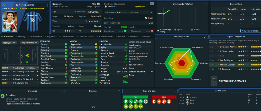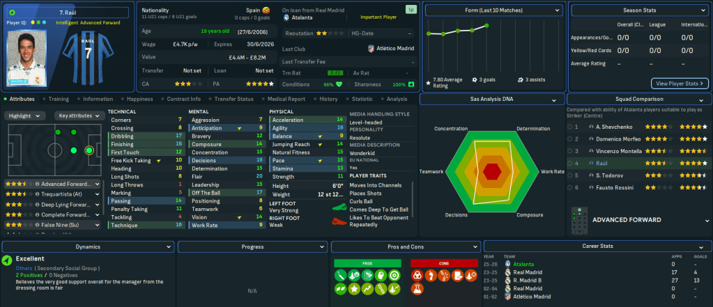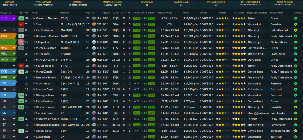 In his absence, their star players stepped up. Morfeo scored one and created 2 for Montella in a 3-2 win at Napoli and Raúl bagged consecutive braces in a 3-0 win at home to Cesena and, most impressively, a 3-2 win at 2nd-place Milan. The improving Riquelme got in on the party with a hat trick in a crushing 5-1 win at home to Cagliari, which lifted Atalanta into the top 6 for the first time, before Montella, Raúl and Morfeo saw off bottom side Salernitana and Montella’s brace sealed a vital 2-0 win at home to Parma.